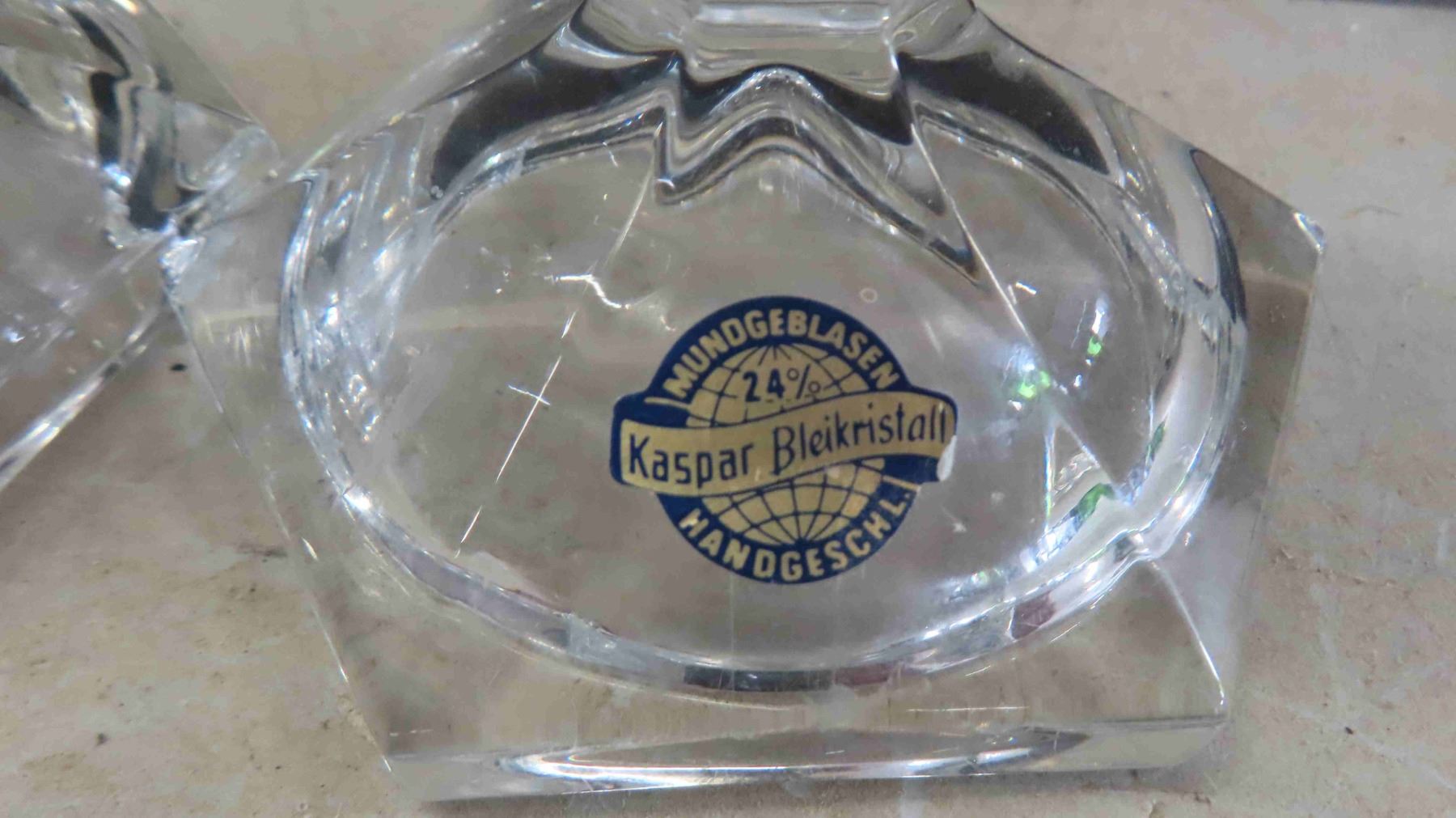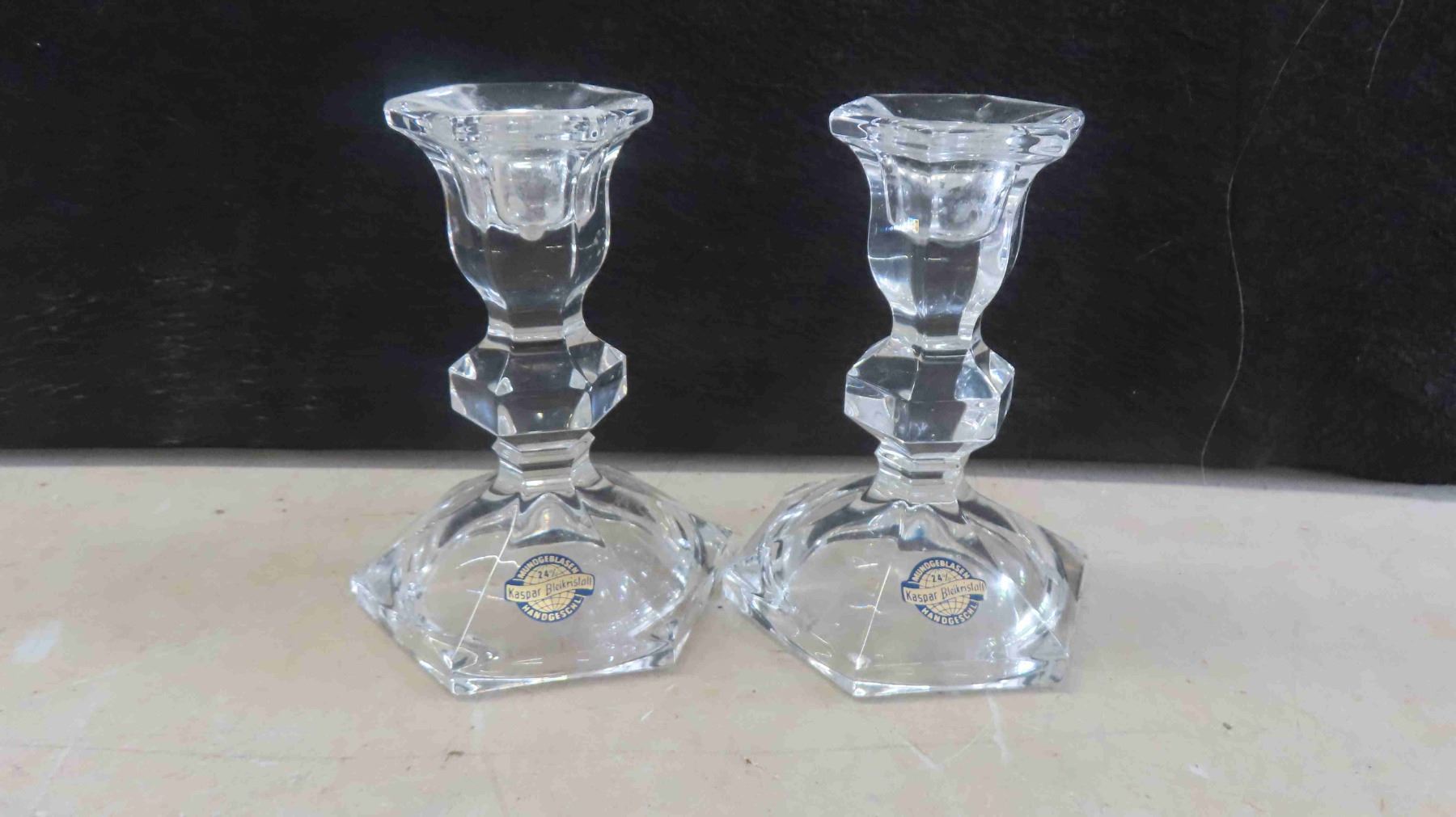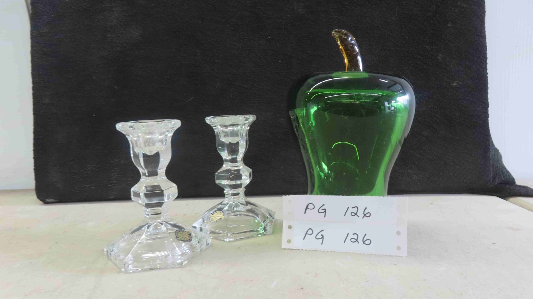Green Apple Art Glass 8'' x 5'' , Matching Kaspar Bleikristall Candle Stick Holders 5'' x 3 1/4''