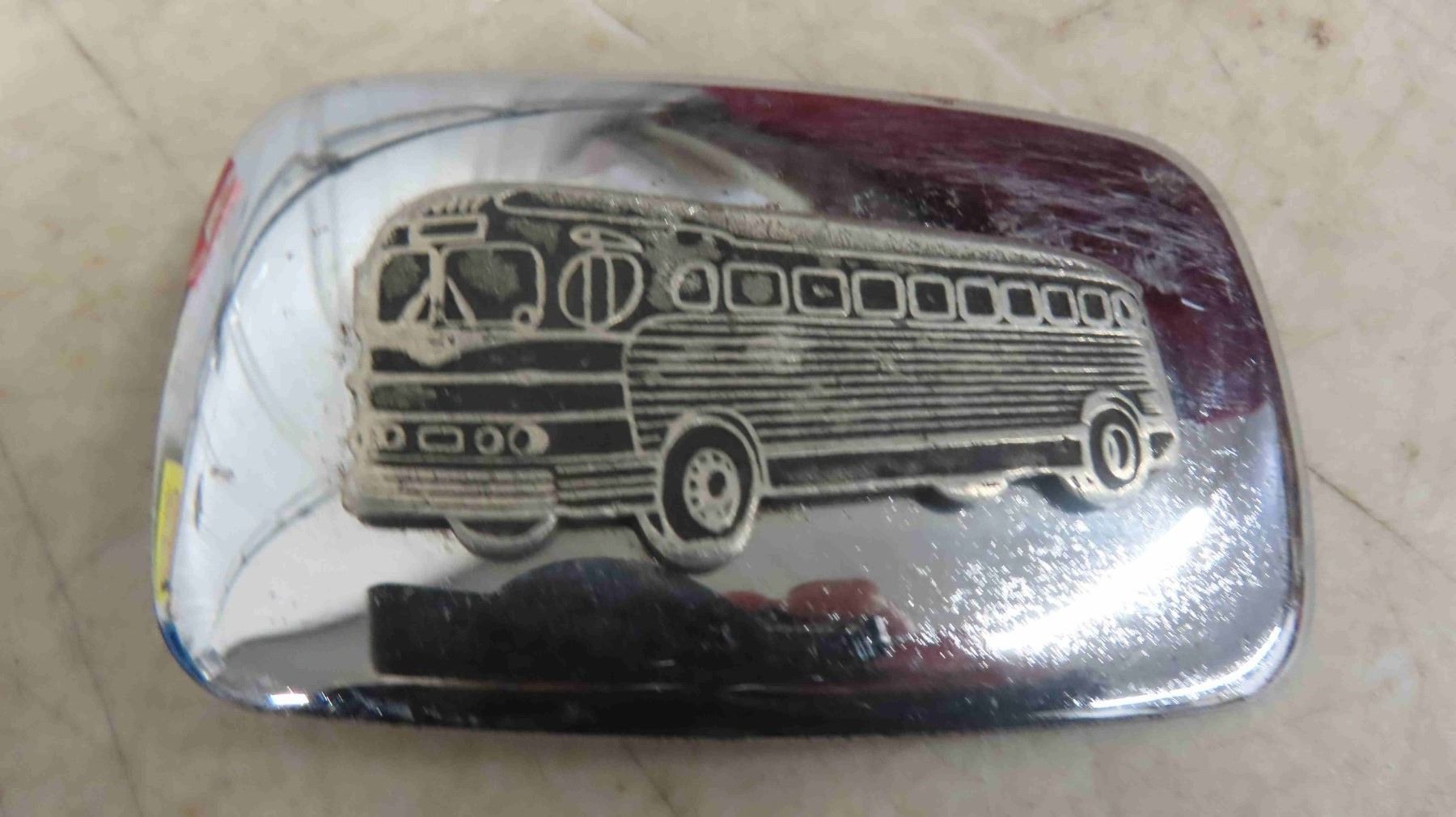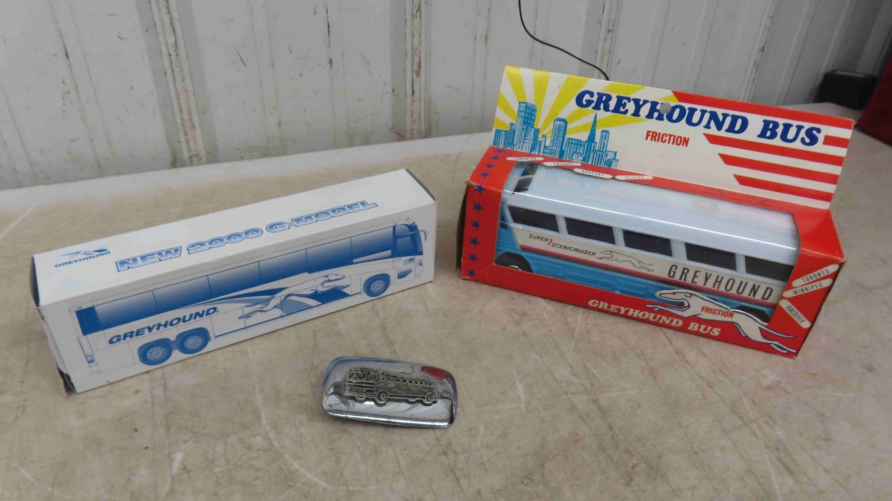 Greyhound Bus Lines Toy Lot: All in Original Boxes - Friction Bus , Coin Bank Bus, Vintage Metal Bus Belt Buckle
