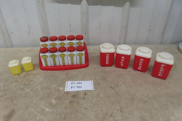 Griffiths Milk Glass Spice Jars with Rack, 4 Plastic Cannisters, Salt + Pepper Shakers