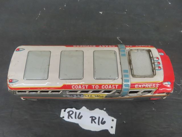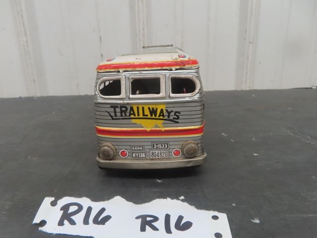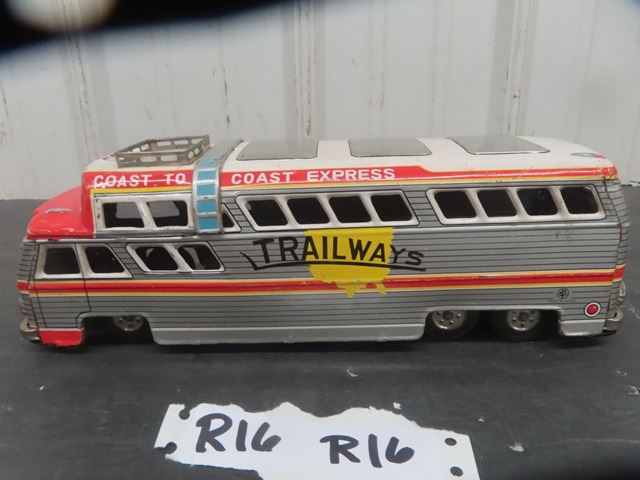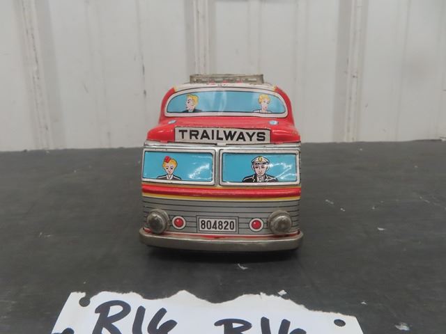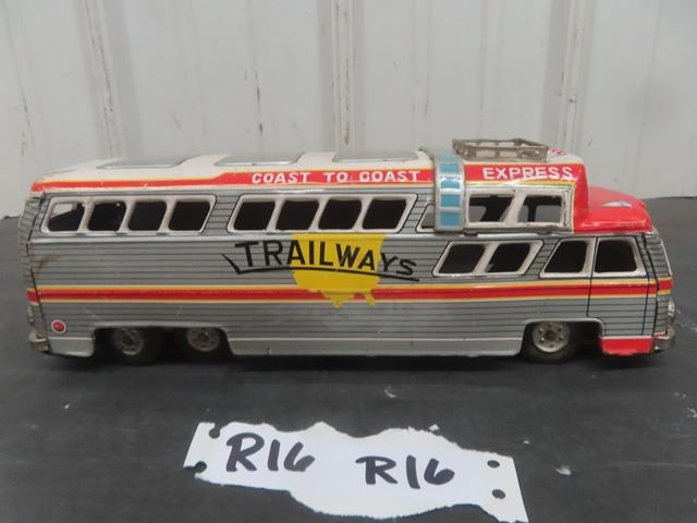 H & S Made in Japan Tin Friction Trailways Bus 3.5  x 3 3/4  x 11.5