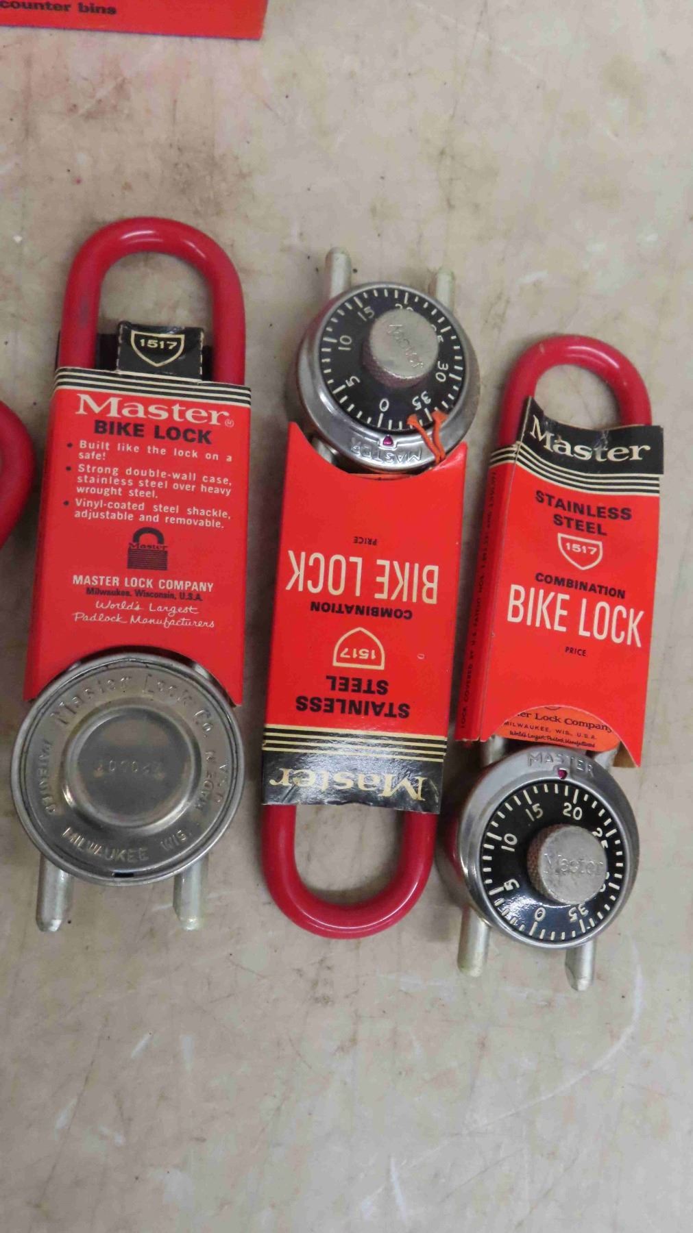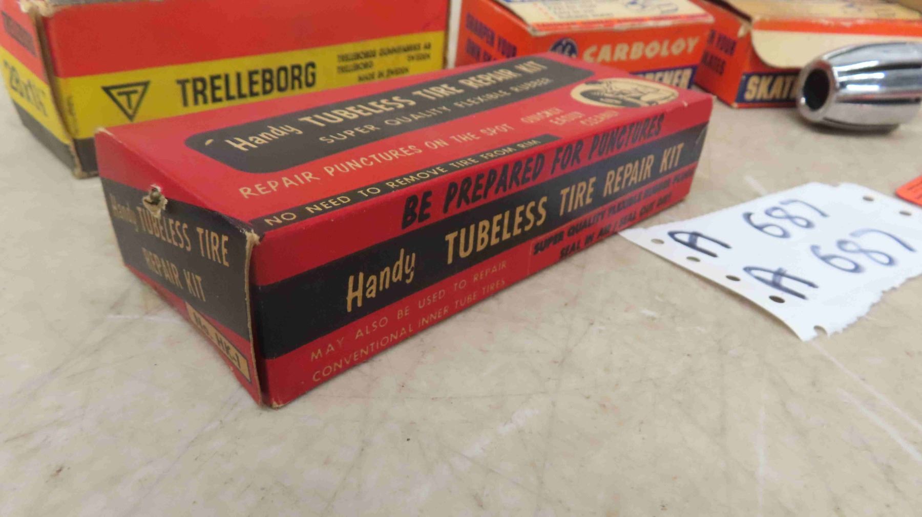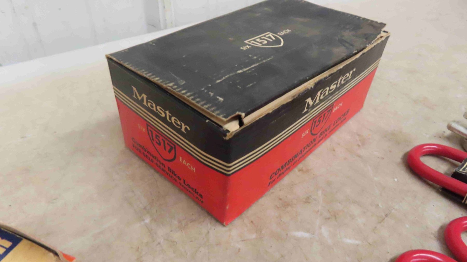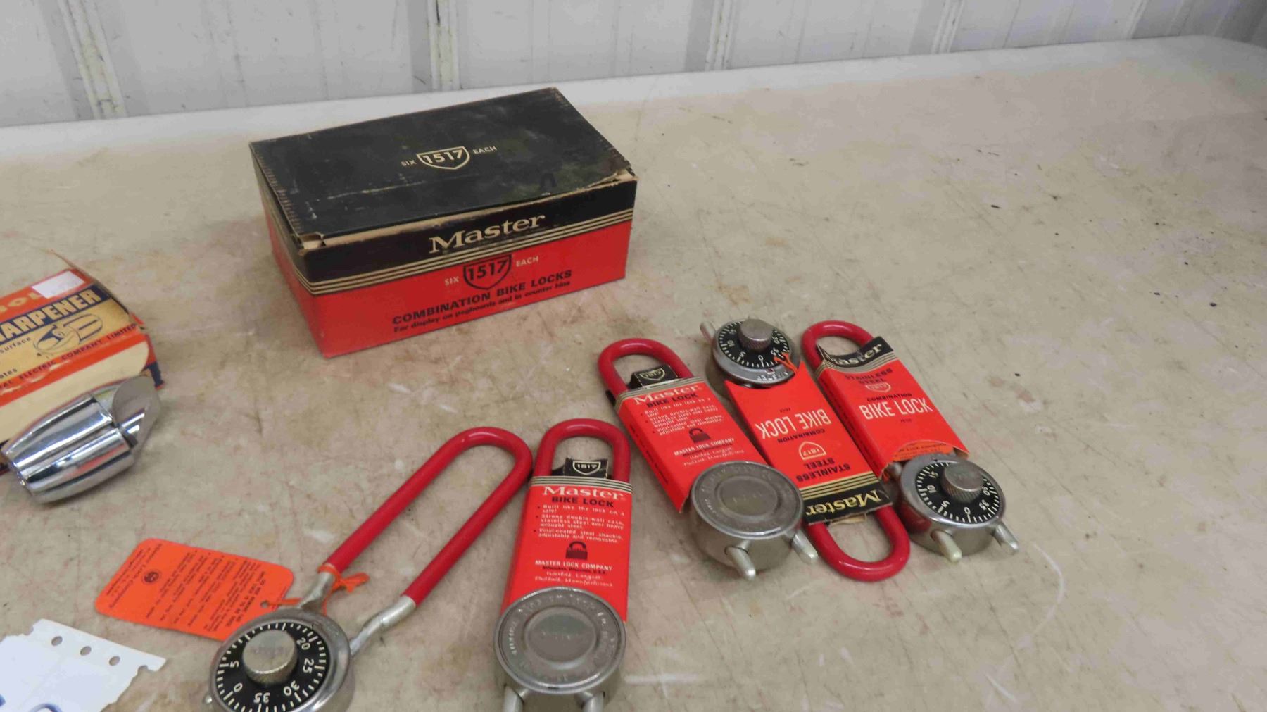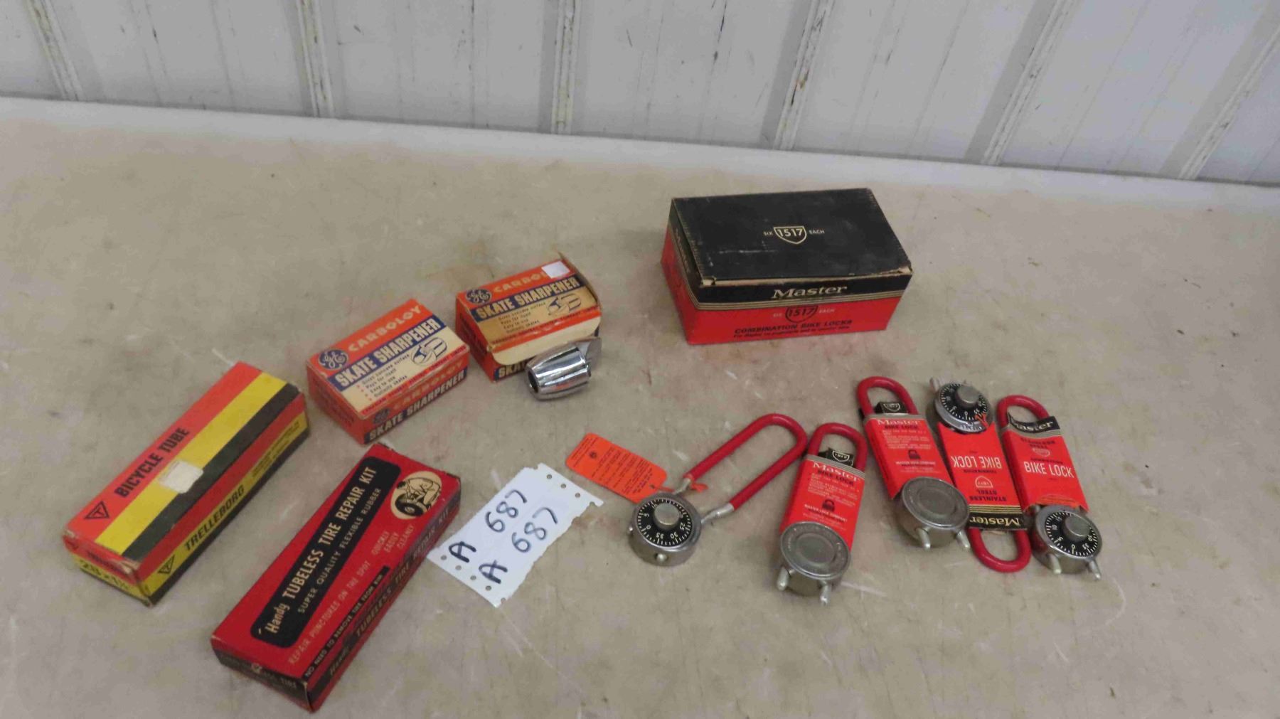 Handy Tubeless Tire Repair Kit, Bicycle Tube, 2 GE Carboloy Skate Sharpener, 5 Master Combination Bike Locks -All Look Like New Old Stock