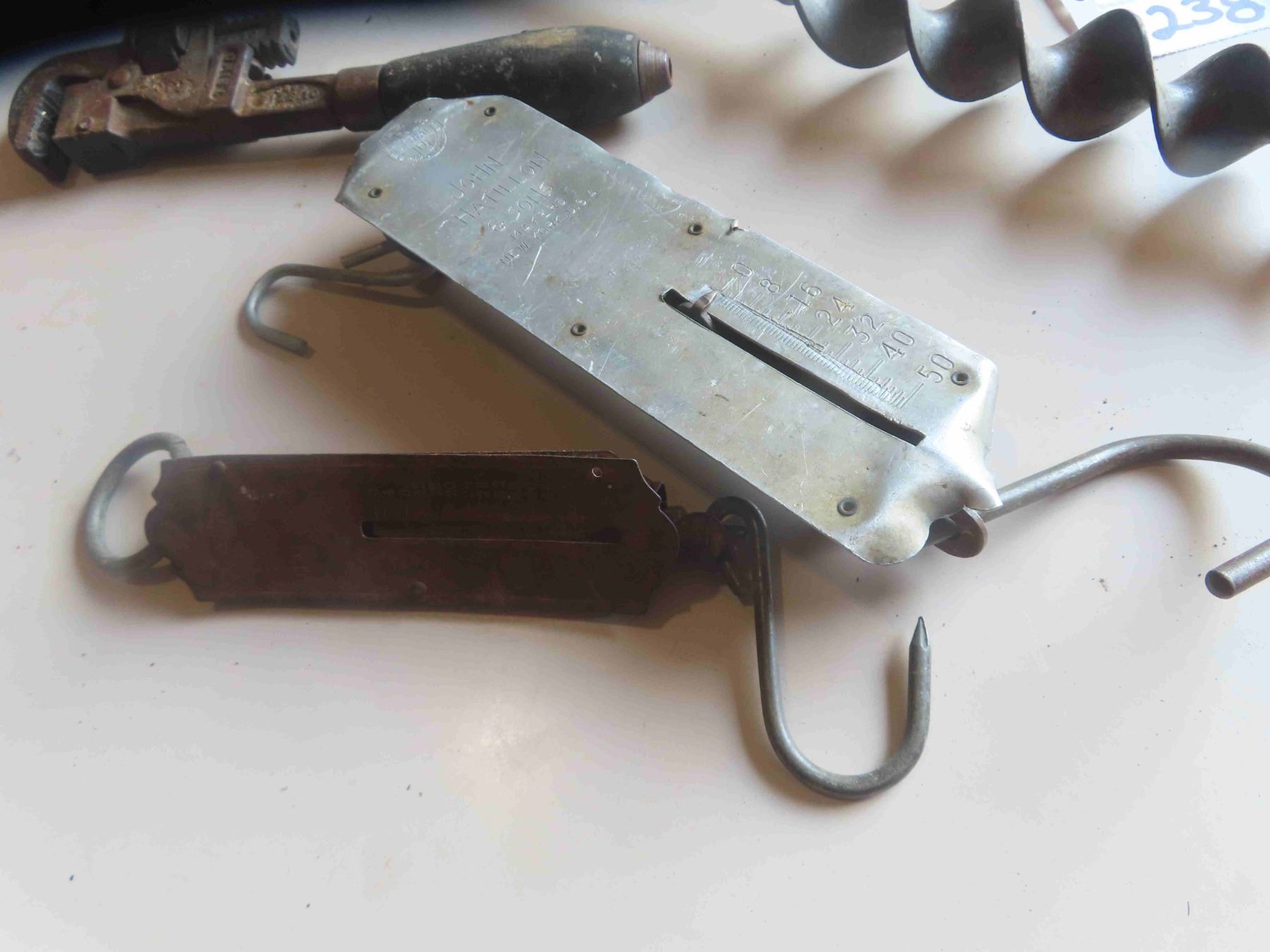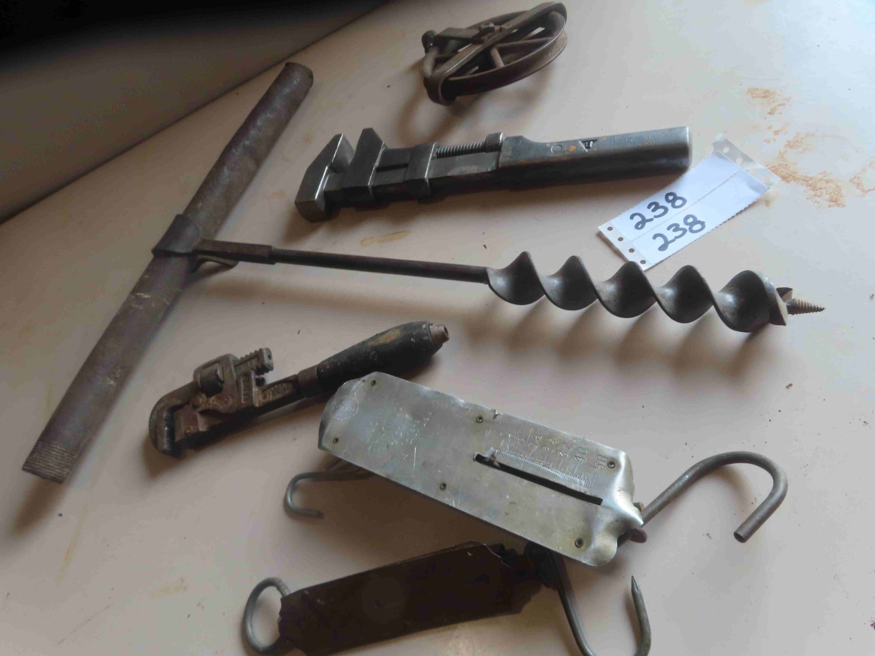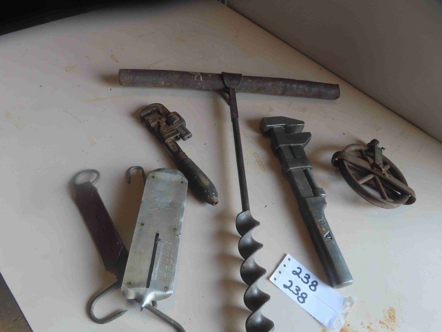 Hanging Fish Scales, Well Bucket Pulley, Auger Bit, Pipe Wrench