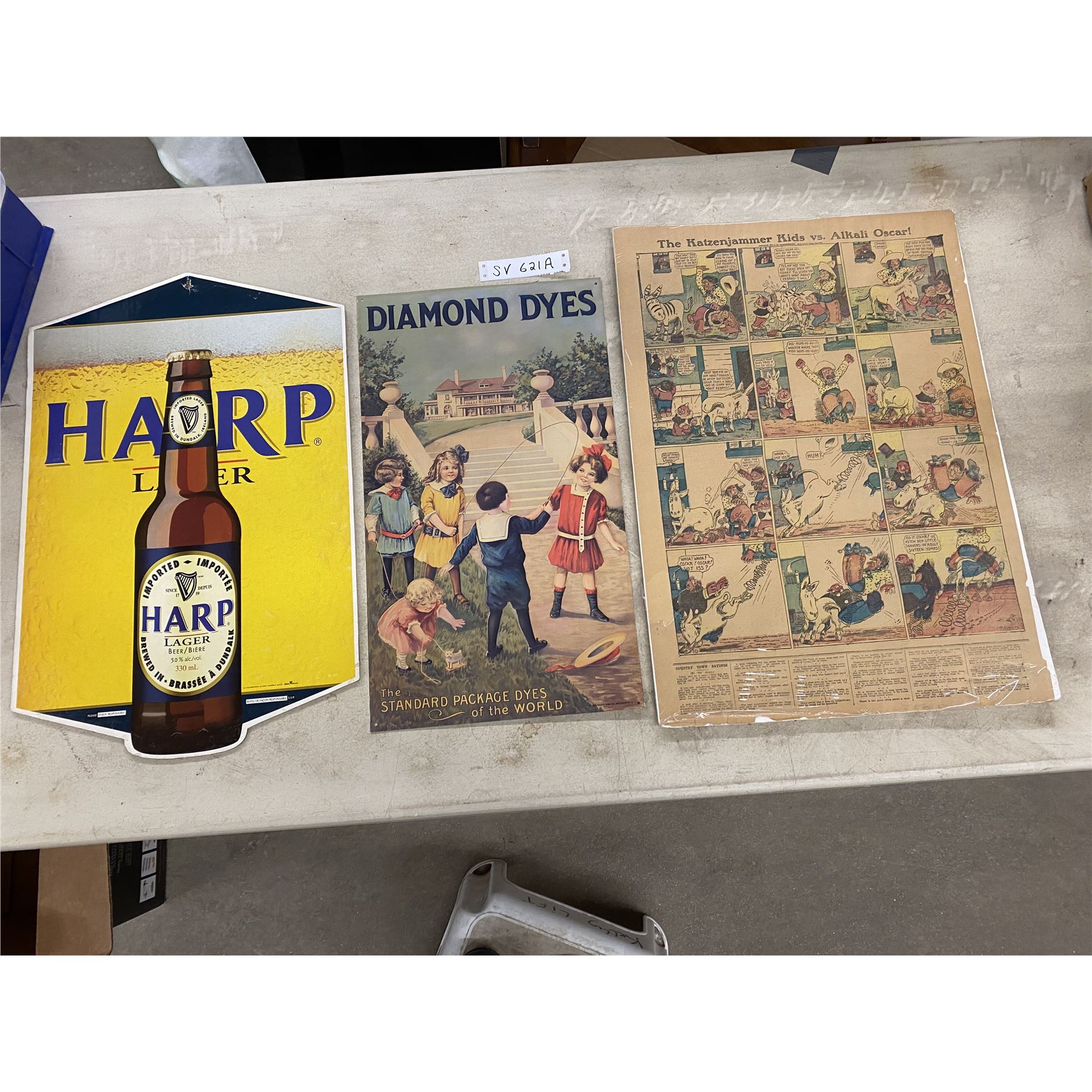 Harp Hager Beer Cardboard Sign 14'' x 22'' , Diamond Dyes Metal Reproduction Sign 11'' x 20'' , Katzenjammer Kids Full Page Comic 16'' x 23''