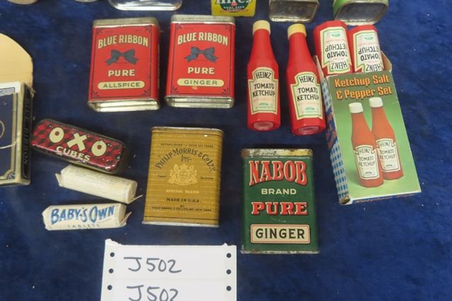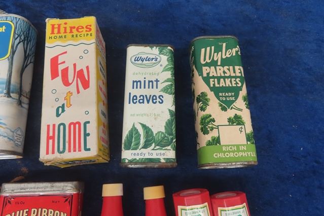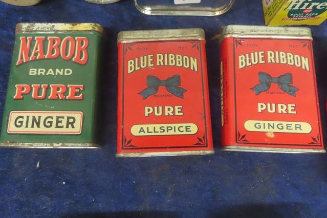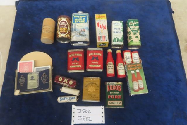 Household Product Tins; Maple Syrup, Wylers, Nabob, OXO, Blue Ribbon Spices, Blue Ribbon Playing Car