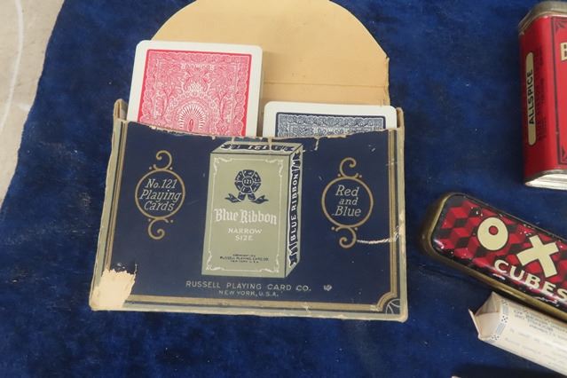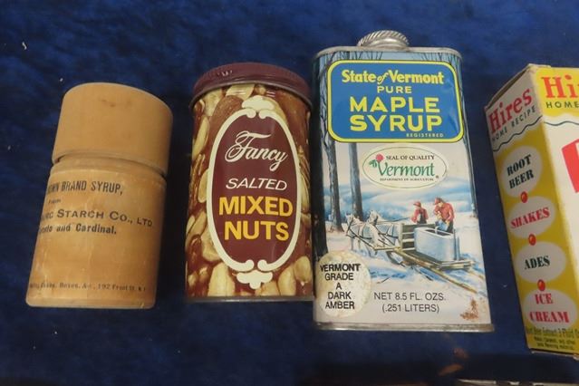 Household Product Tins; Maple Syrup, Wylers, Nabob, OXO, Blue Ribbon Spices, Blue Ribbon Playing Cards