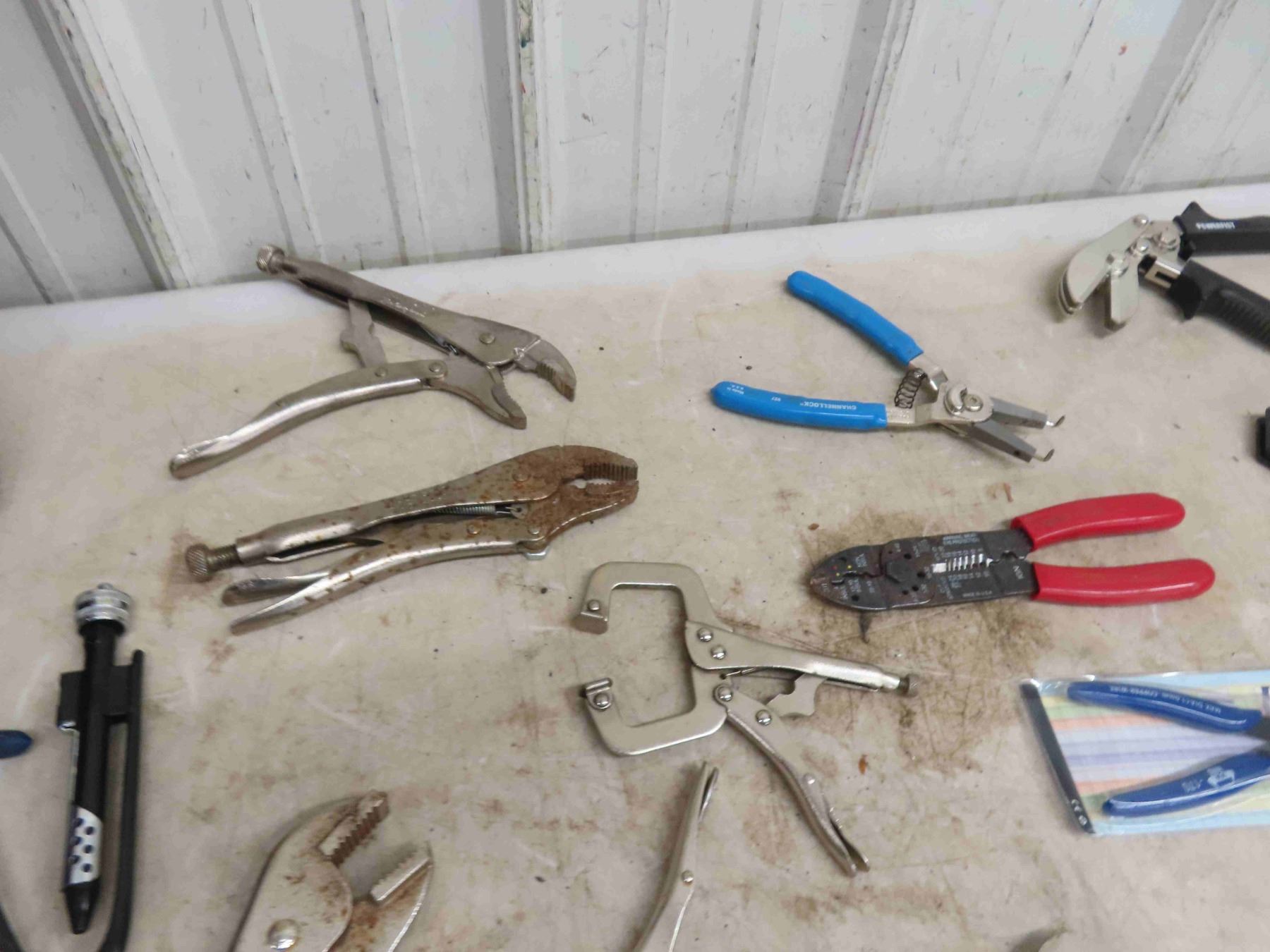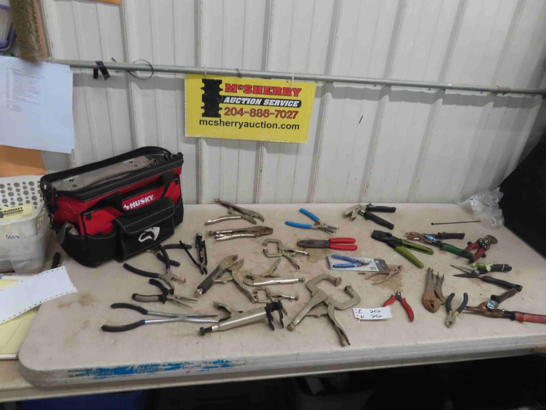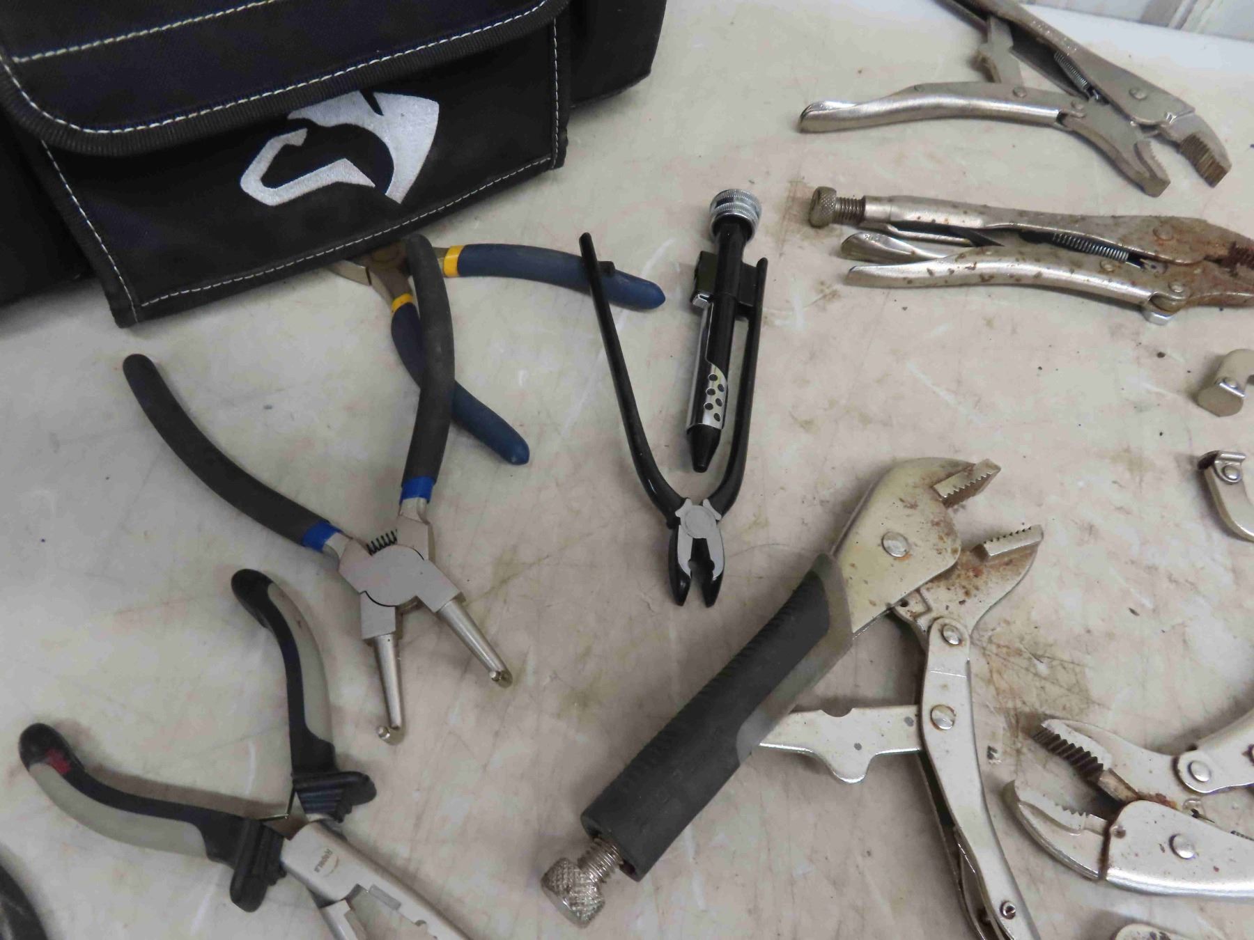 Husky Tool Bag , Vice Grips, Snap Ring Pliers, Crimper,