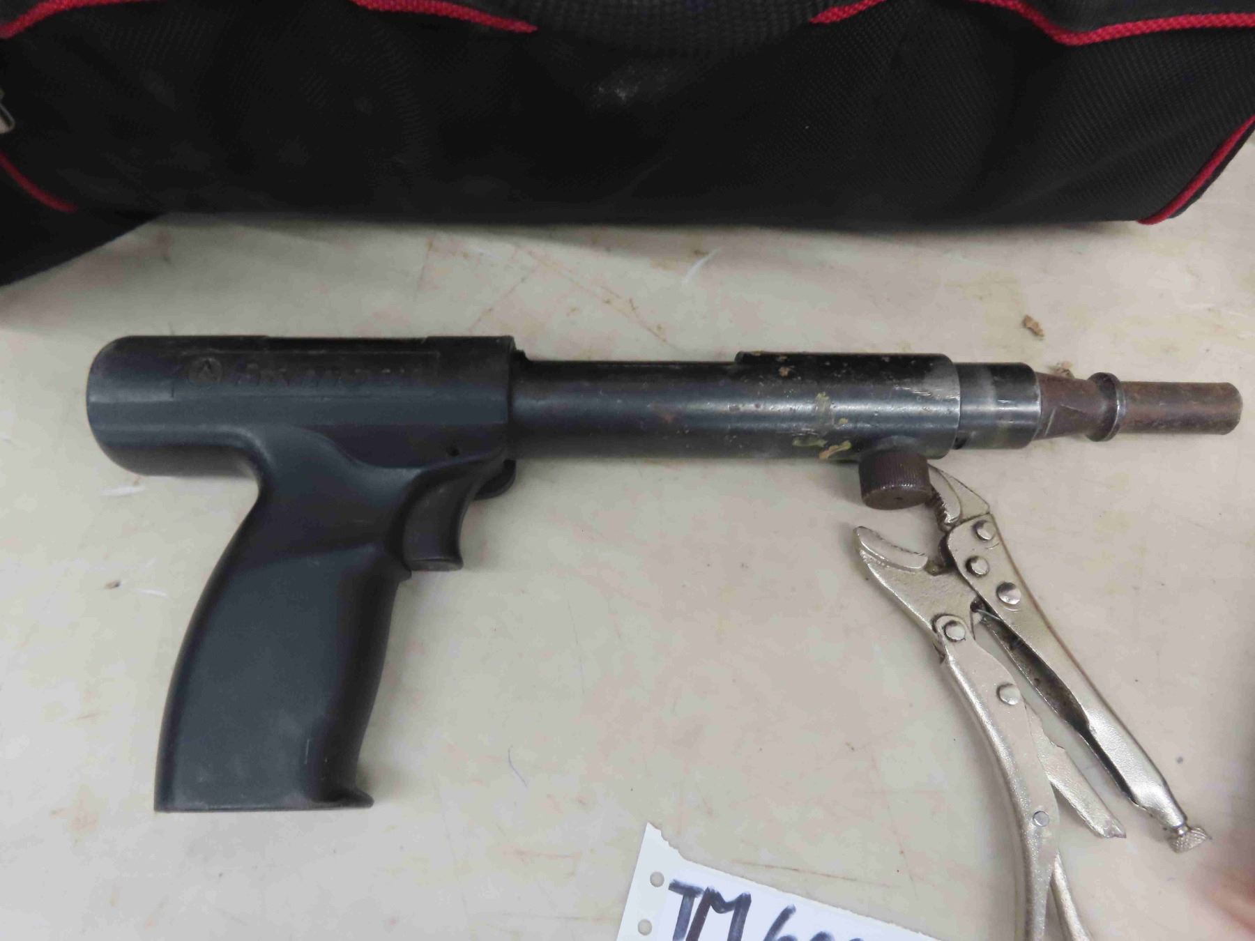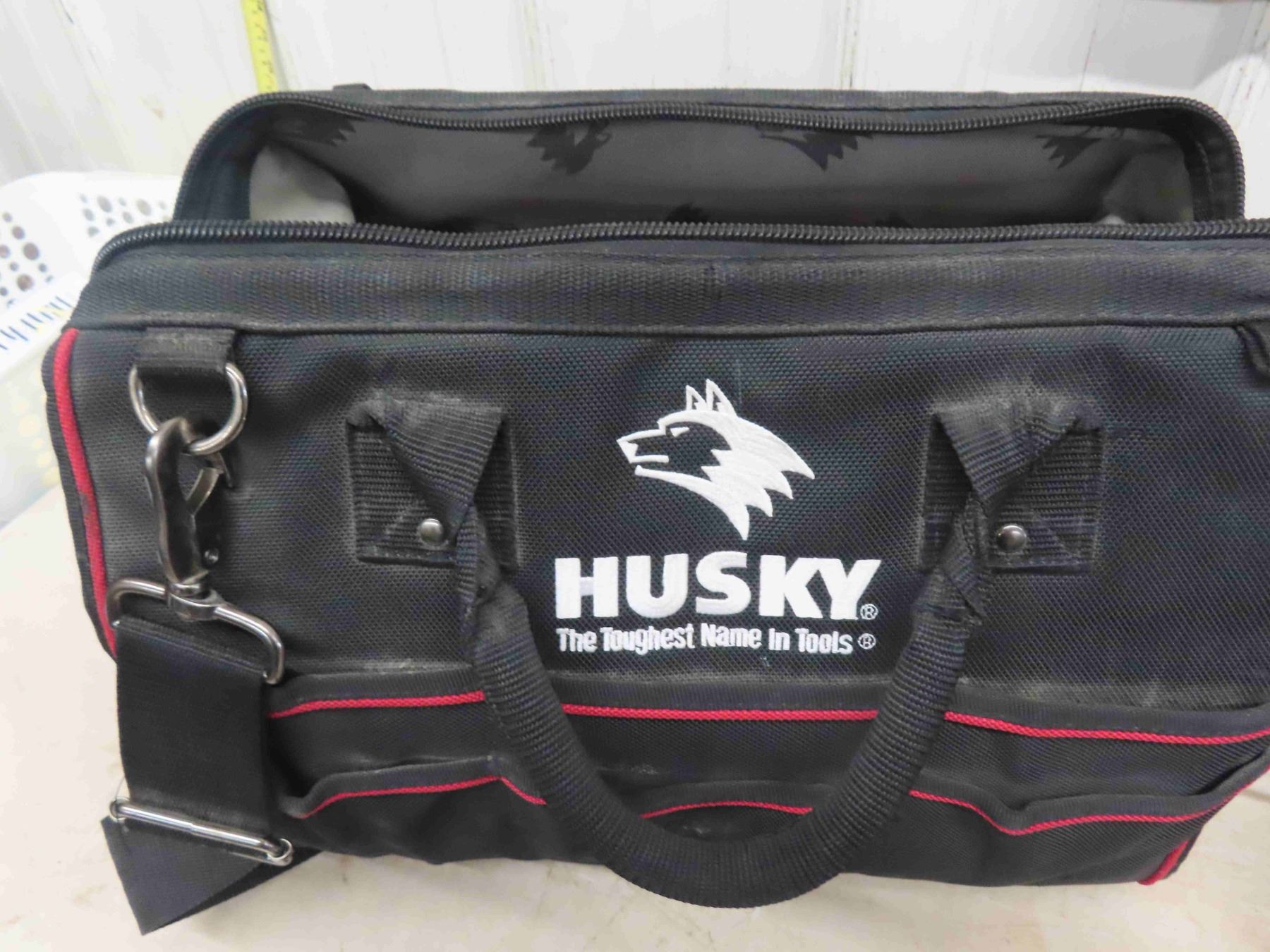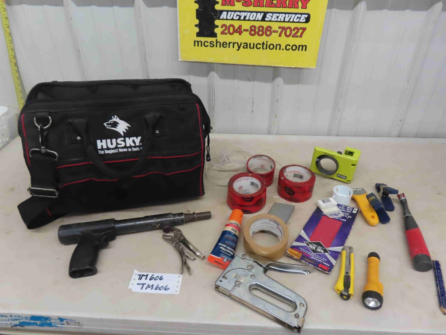 Husky Tool Bag with Assosrted Goodies ; Ramset Concrete Nailer, Stapler, Safety