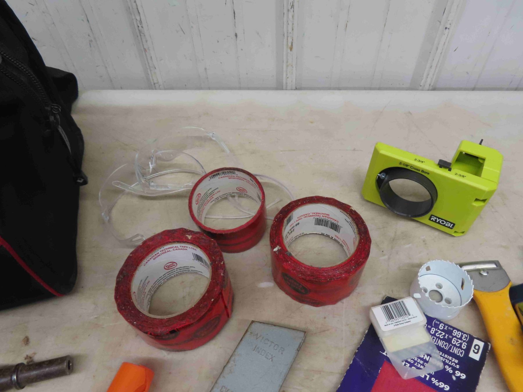 Husky Tool Bag with Assosrted Goodies ; Ramset Concrete Nailer, Stapler, Safety Glasses, Tape, plus more