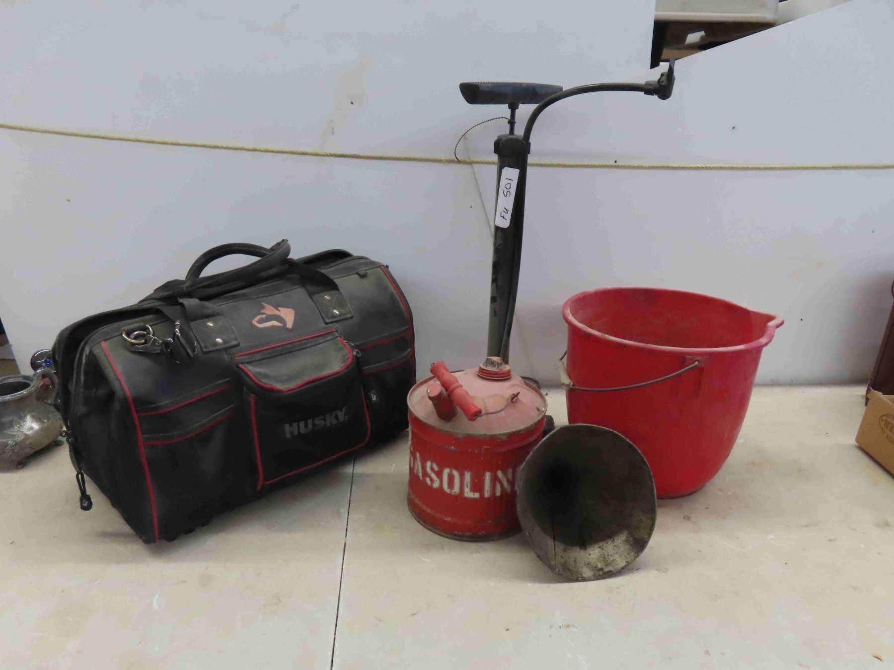 Husky Tool Pouch , Manual Tire Pump , Metal Gas Container , Funnel