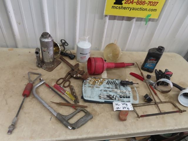 Hyd Jack, Drill Bits, Hack Saw, Puller, Plus Odds Ends Tools, & Set of Car Ramps