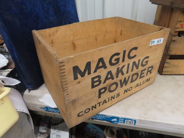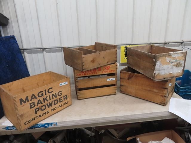 (ID) 5 Wooden Crates 1 is Baking Powder & various Fruit