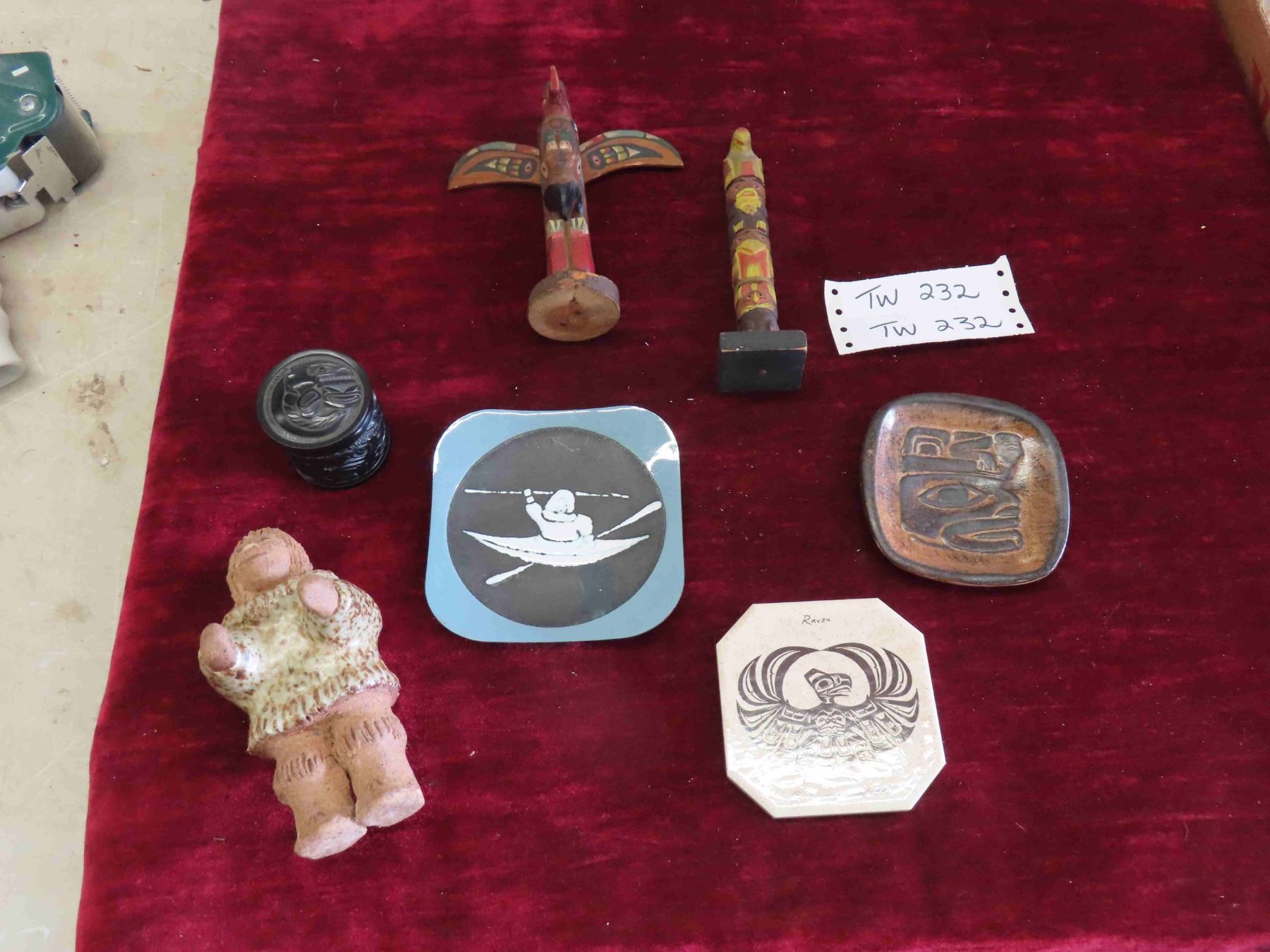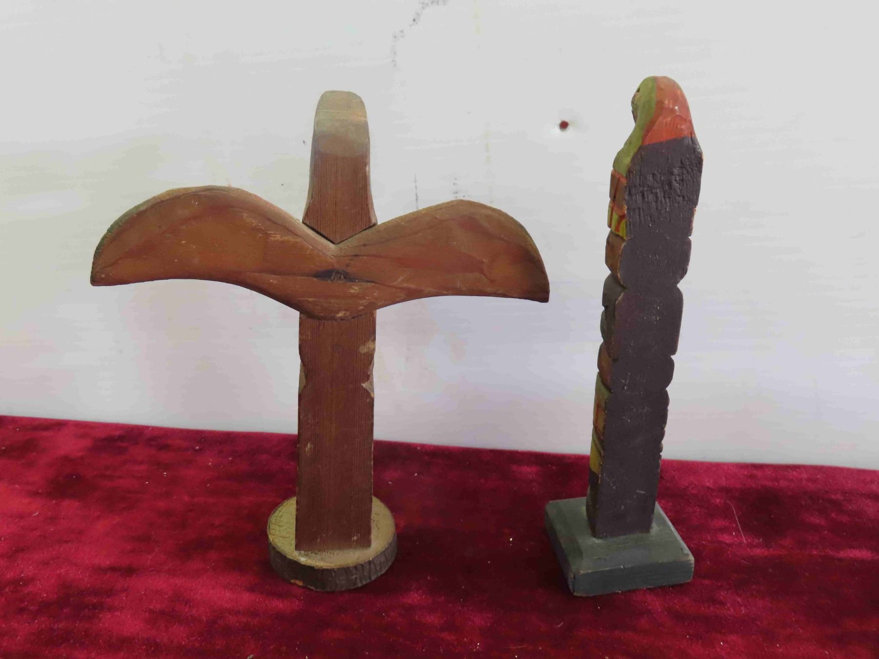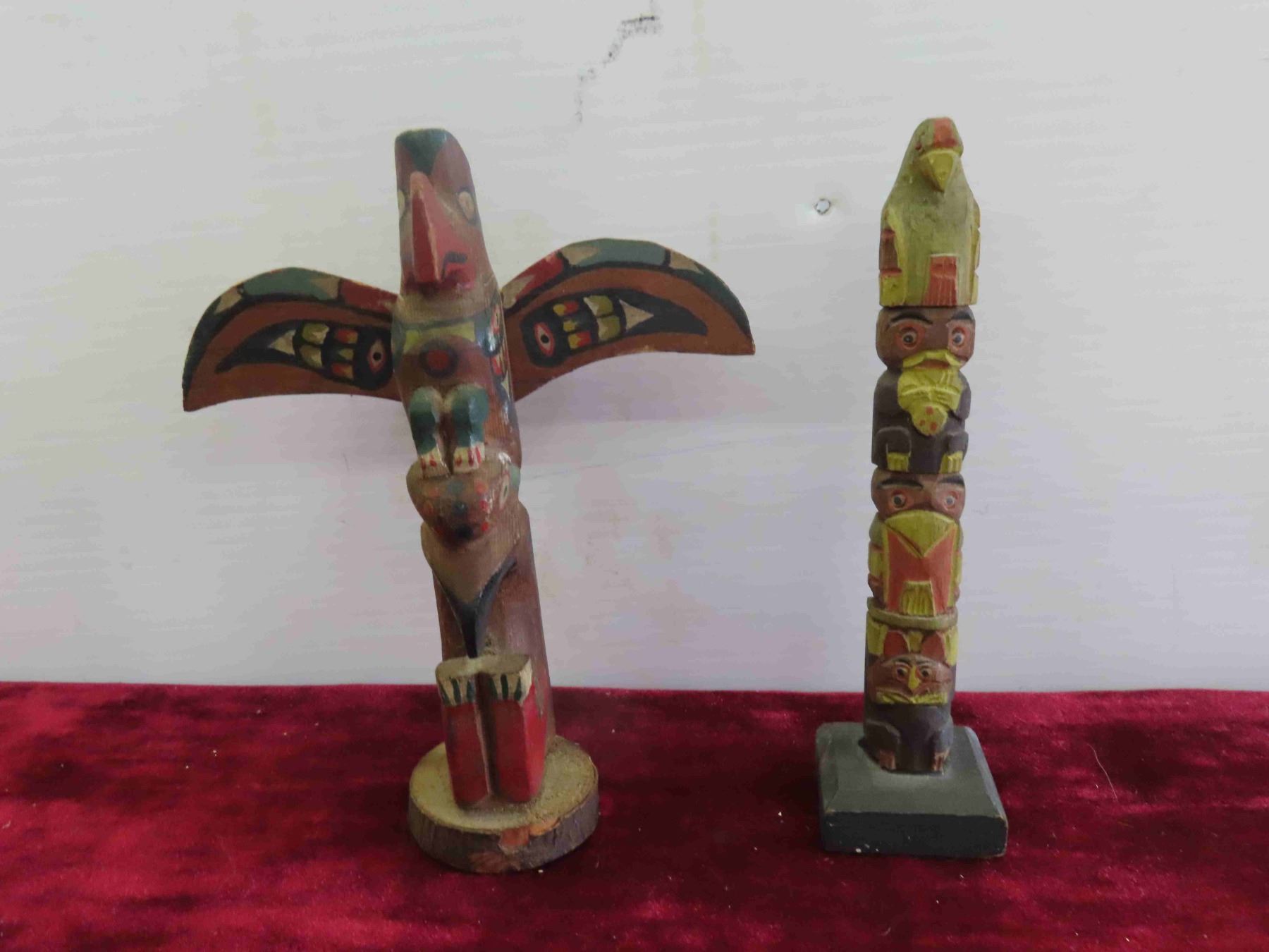 Indigenous Items: 2 Totem Poles, Sculpture, 3 Trinket Dishes, 1 Lidded Container