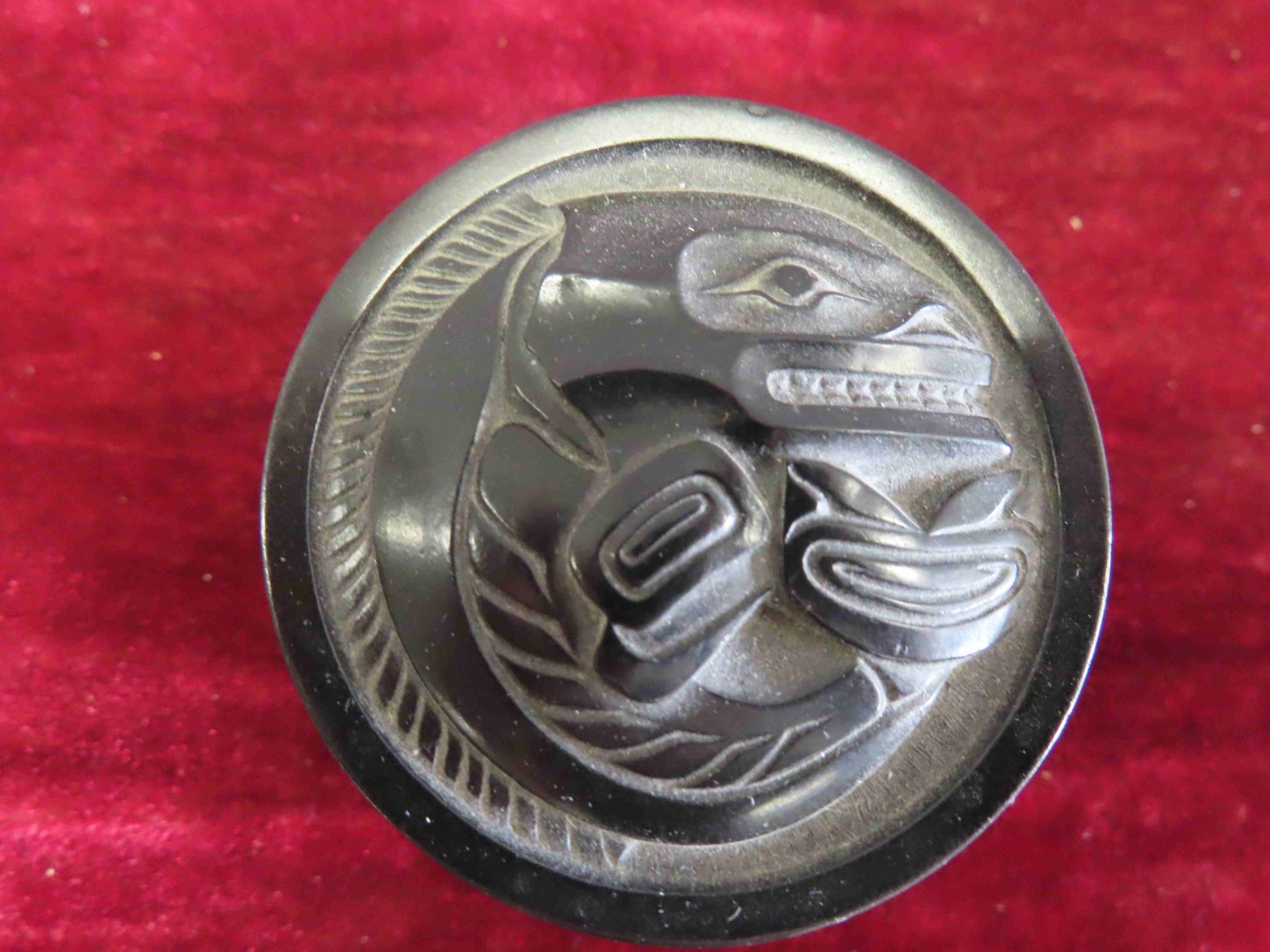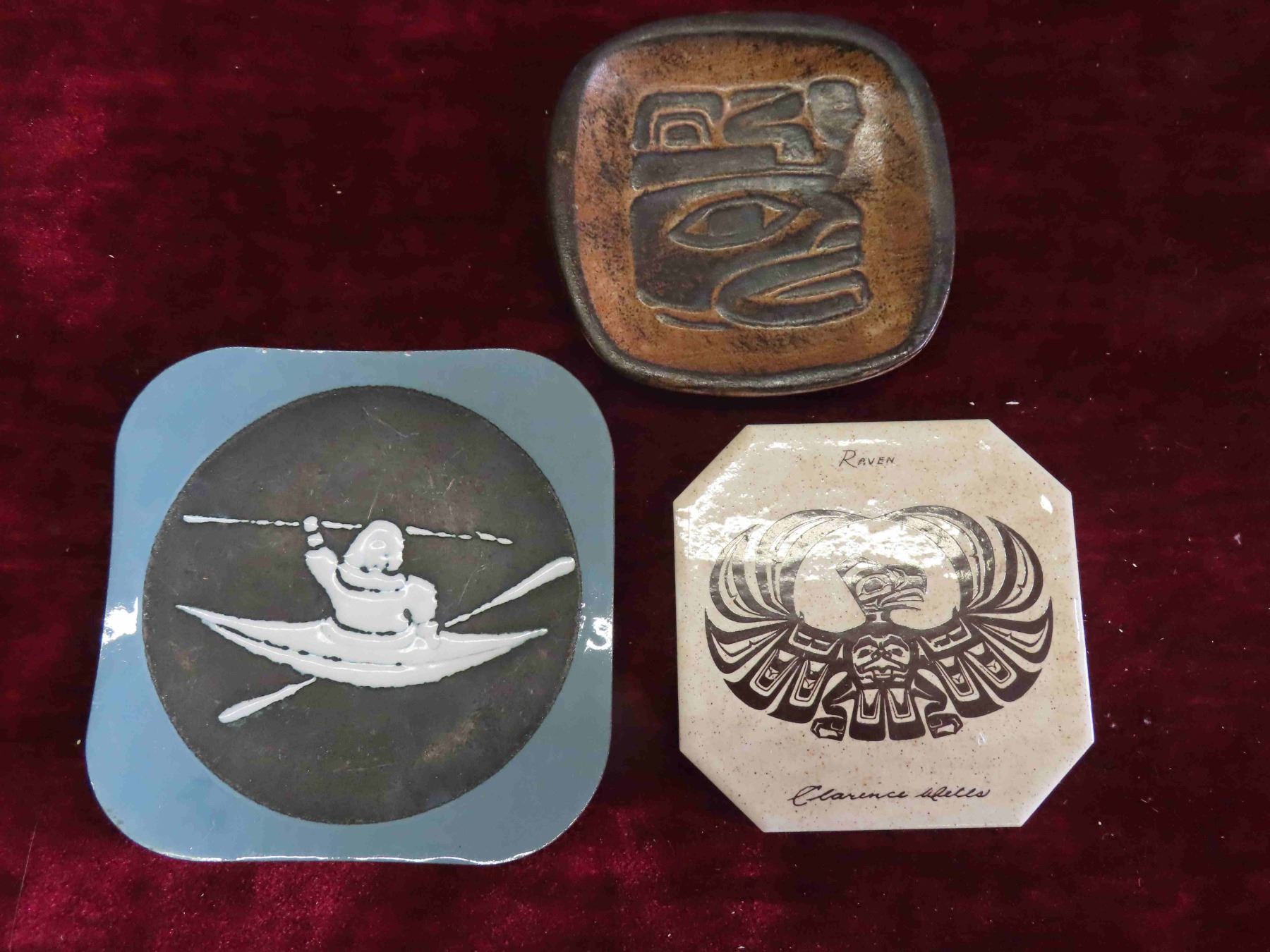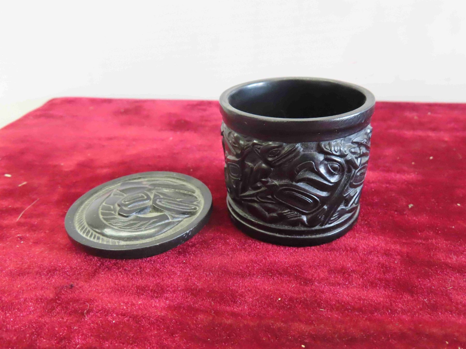Indigenous Items: 2 Totem Poles, Sculpture, 3 Trinket Dishes, 1 Lidded Container