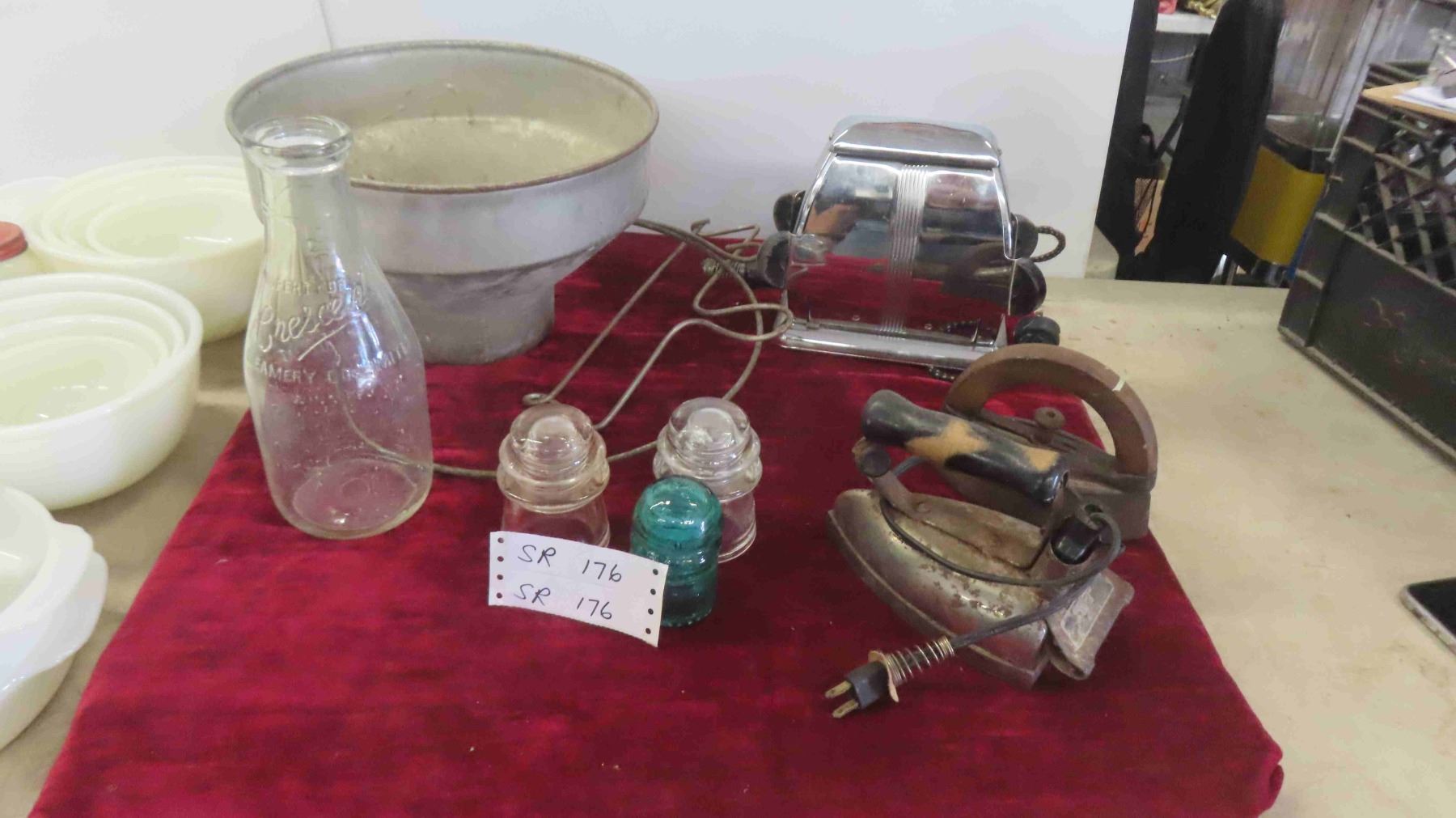 Insulators, Glass Milk Bottle, Vintage Toaster, Irons & Milk Strainer