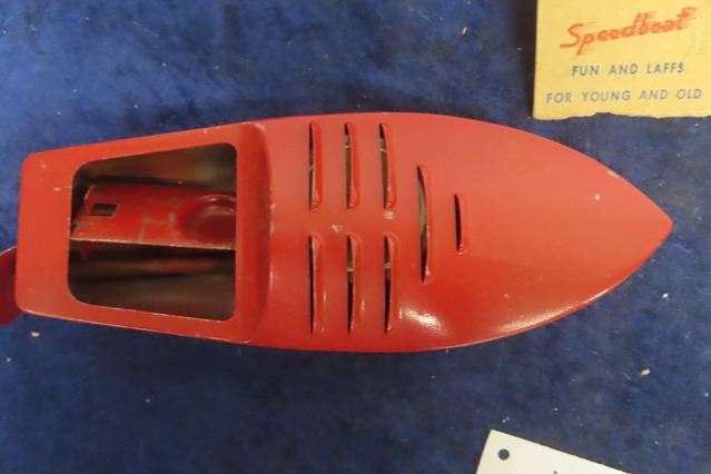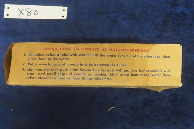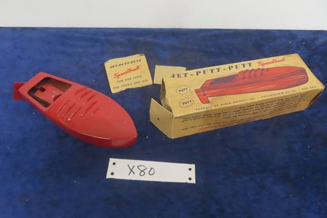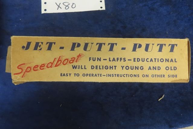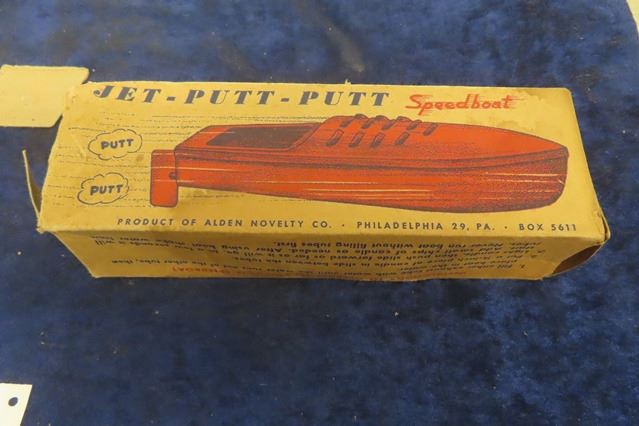 Jett Putt Putt Pressed Tin Speedboat in Original Box Made in USA 7" Long - 1 Box Flap End in Detached