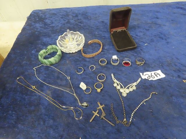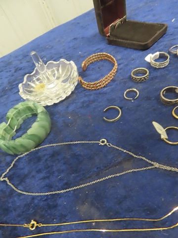 Jewelry Lot - Brass Bracelet, Necklace w Black Onyx Like Pendant, Misc Fashion Rings, Some Damaged Jewelry, Some Bracelets, Sterling Pendants, Ring Dish, Toe Rings Plus More!