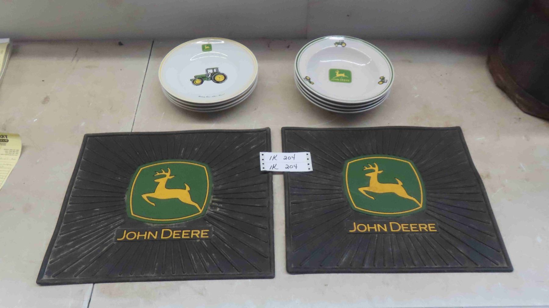 John Deere 8pce Dinnerware Includes 4 Plates, 4 Bowls, 2 Auto Floor Mats, (1 Floor Mat is Torn, See Photos)