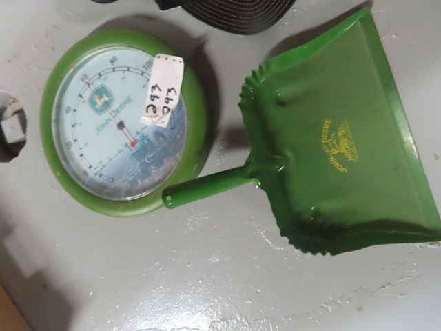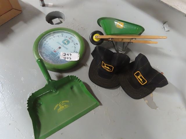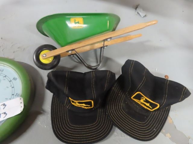 John Deere Thermometer, Dust Pan, Child's Toy Wagon & 2 John Deere Hats
