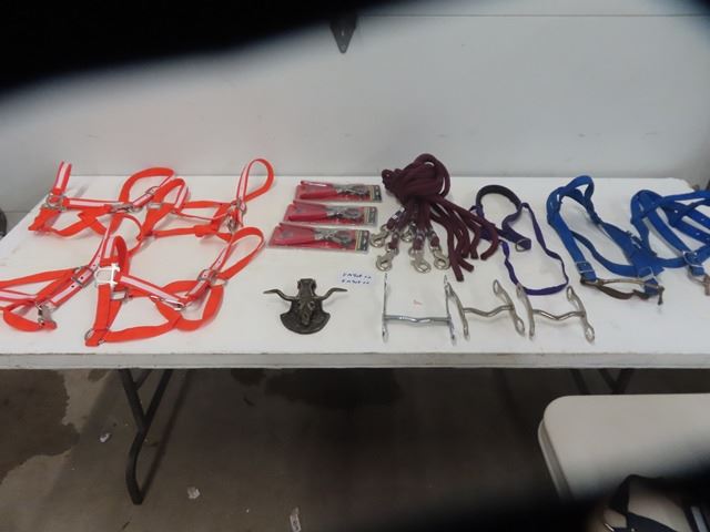 (KM) 12 Lg Horse Halters, 3 Leather Punches, 5 - 7 Foot Lead Rope, 3 Bits, Door Knocker Long Horn Me