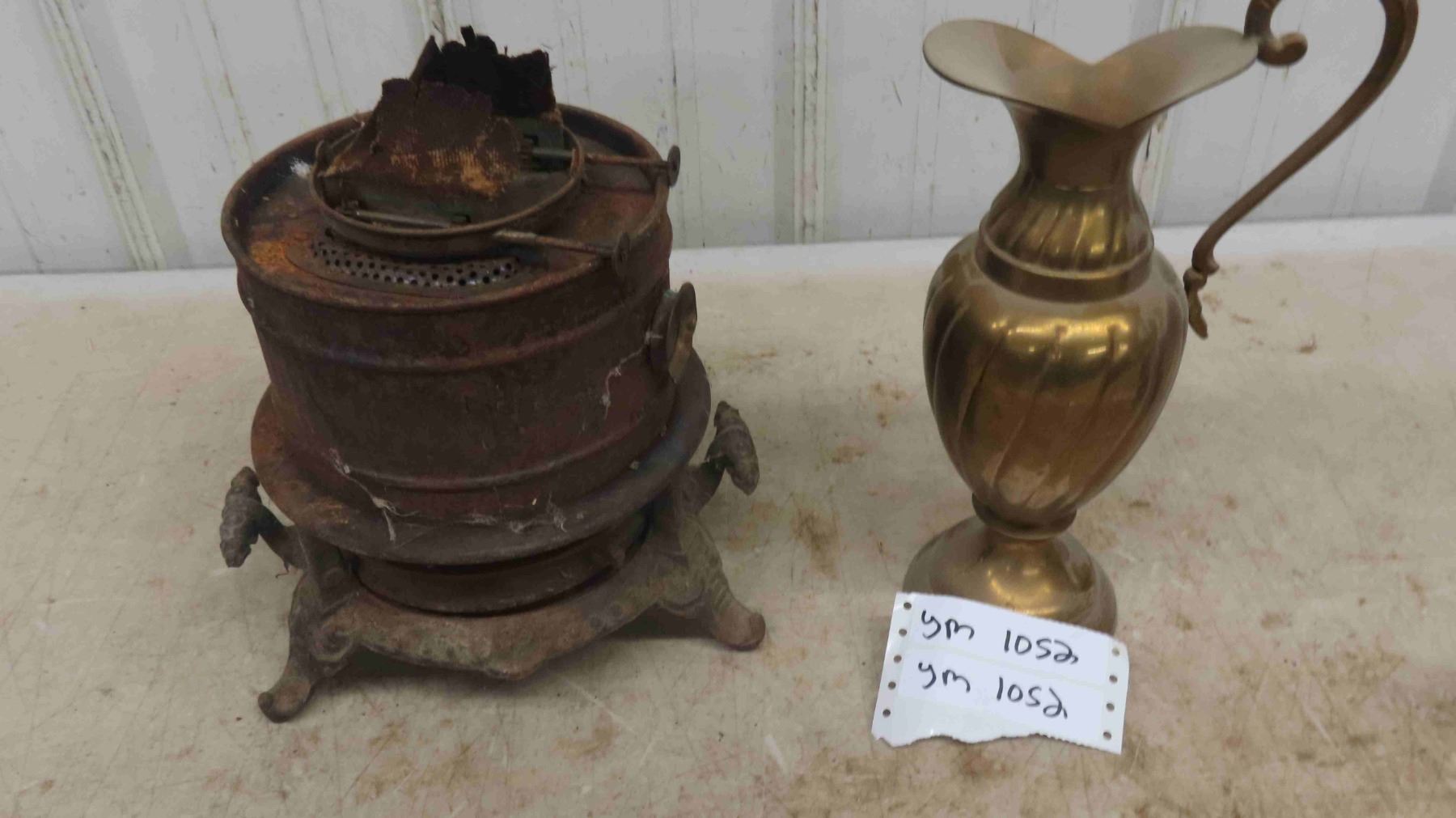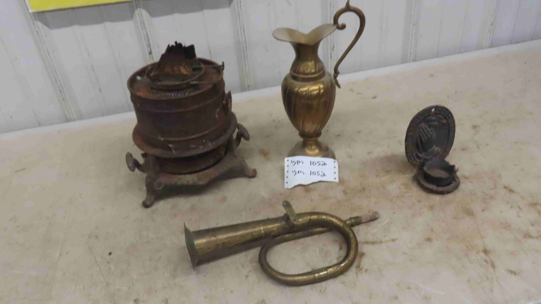 Kerosene Heater with Cool Cast Base, Old Cast Candlier with Religious Design, Brass Pitcher/Vase, Horn