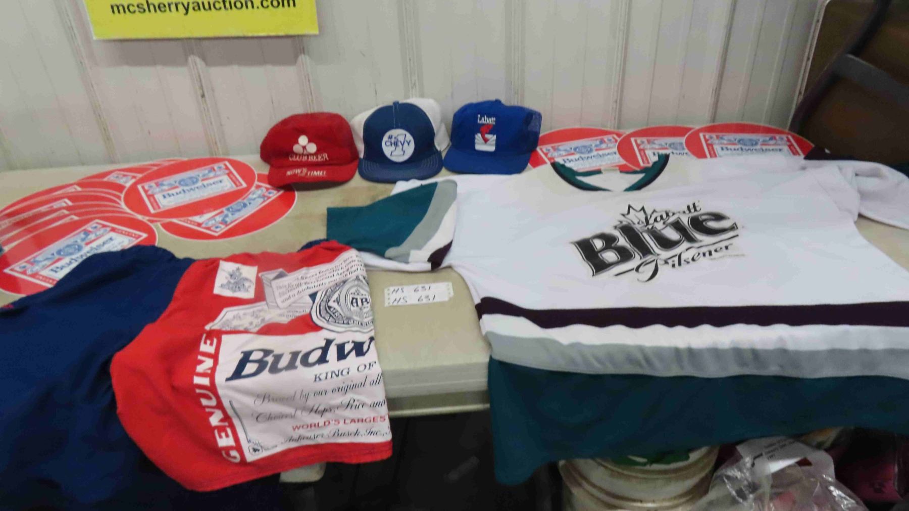 Labatt's Blue Jersey sz XL, Budweiser Shorts Sz Lg, Ball Caps, Budweiser Giant Coasters?