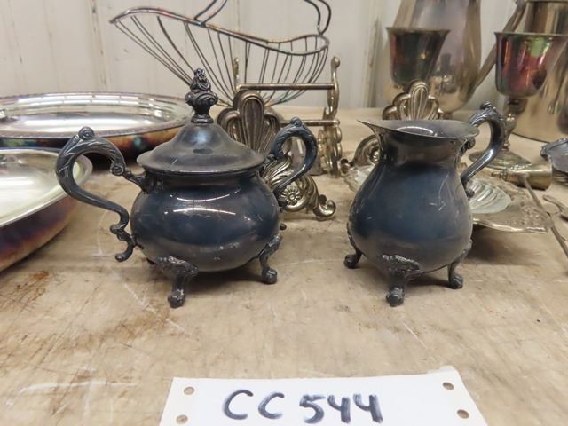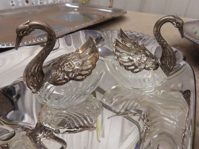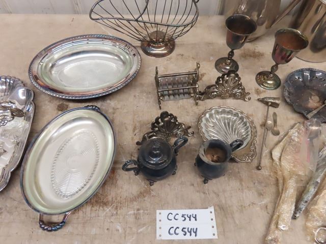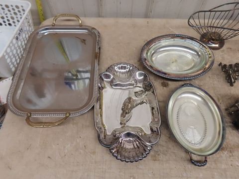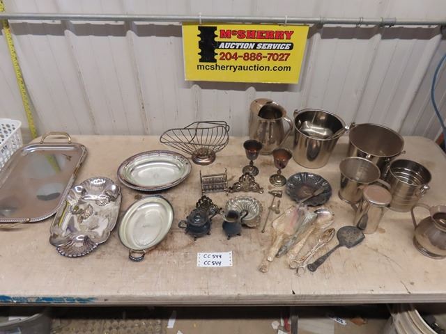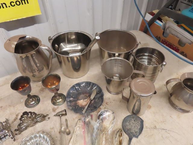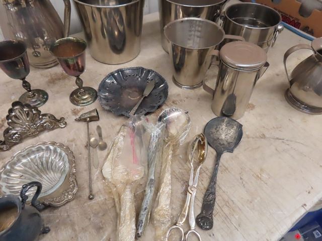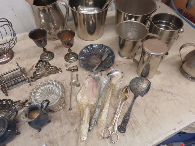 Large Assortement of Silver Plate + Chrome ; Platters, Buckets, Utensils, Jugs, plus more