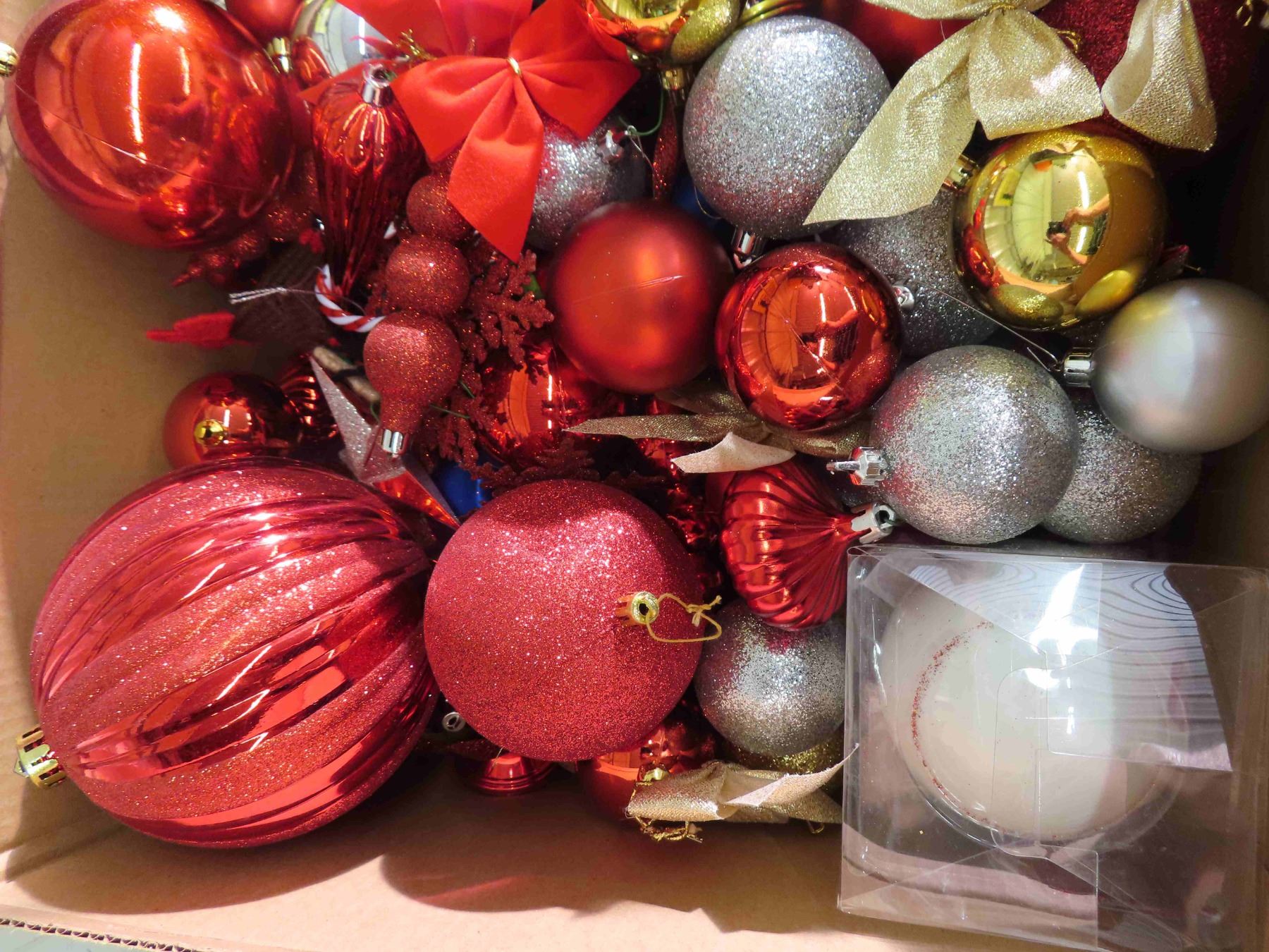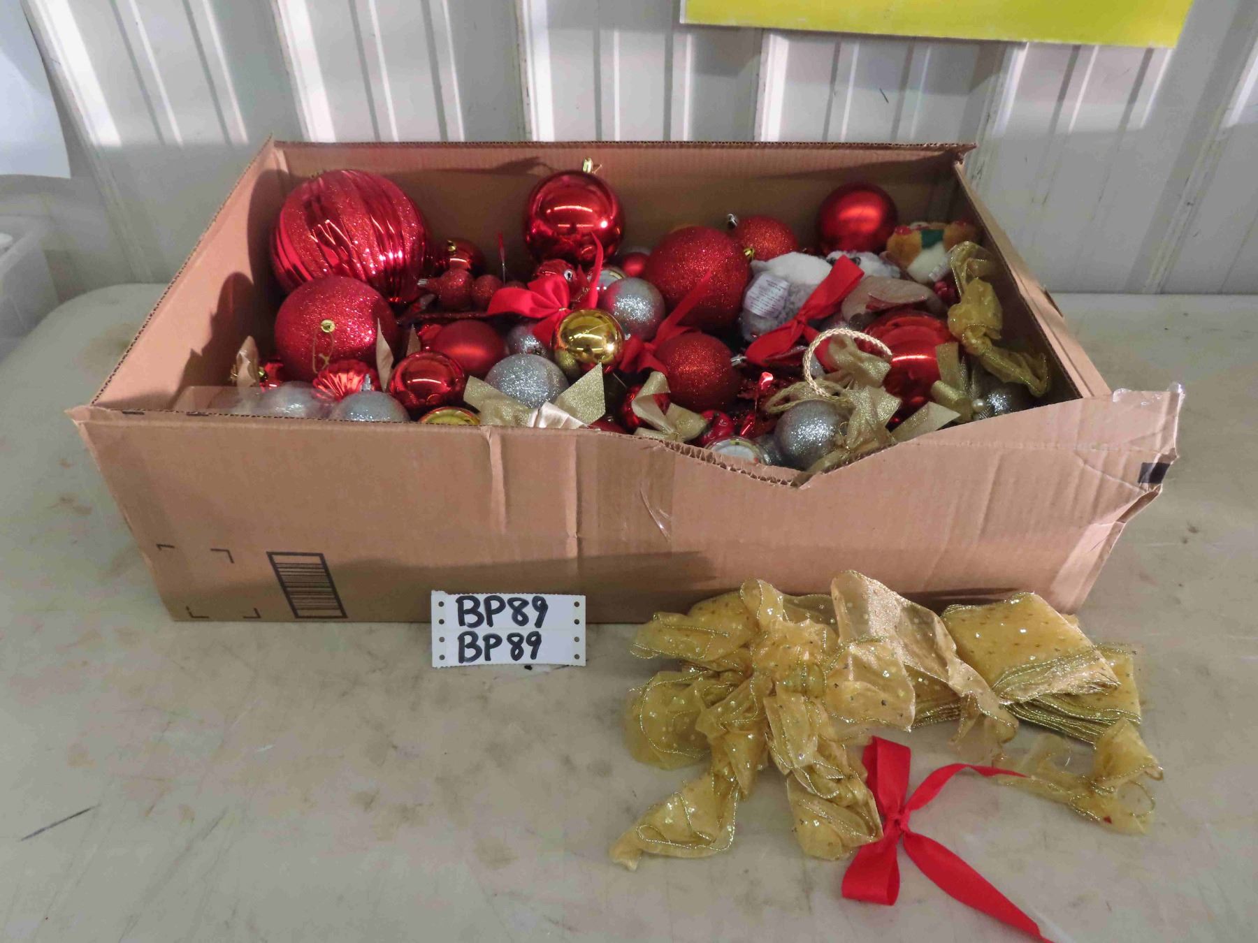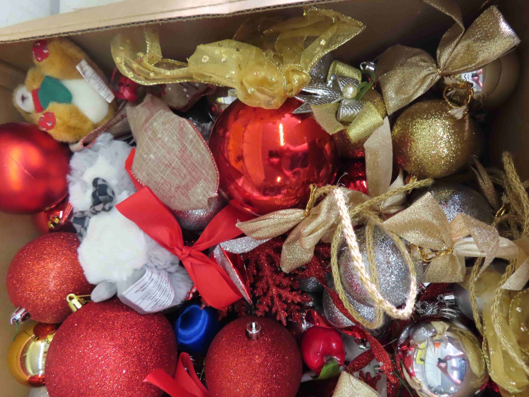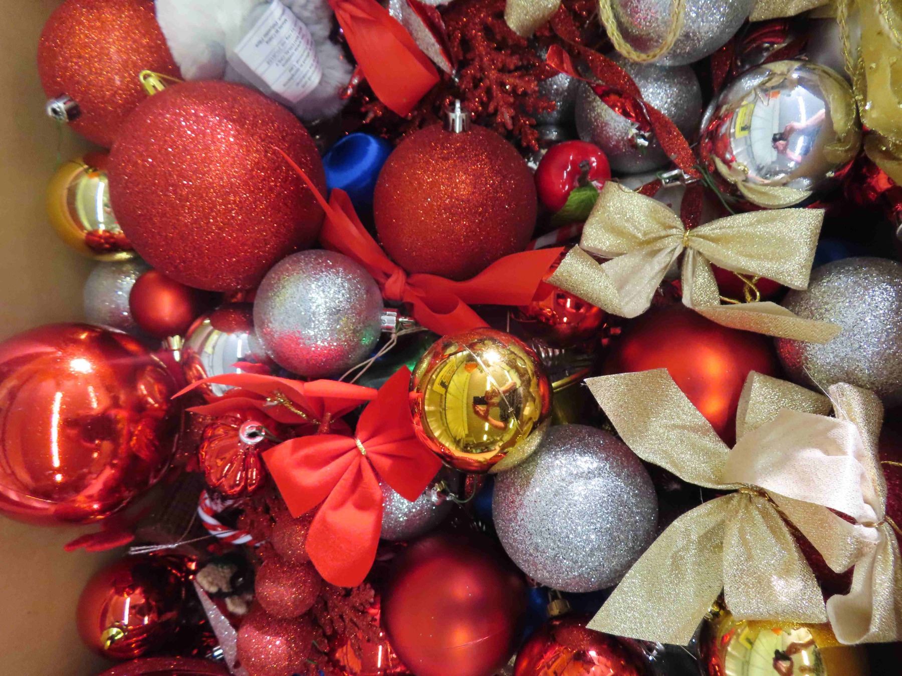Large Box Loaded with Christmas Ornaments, Balls + Bows