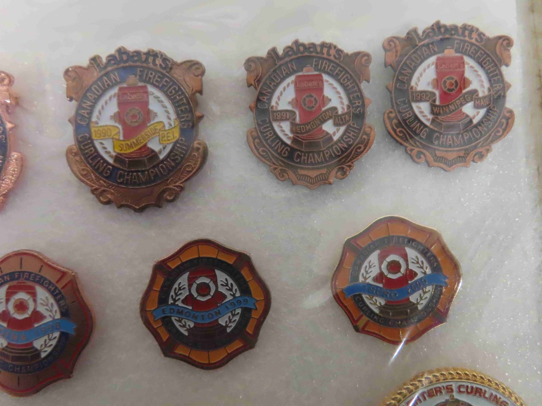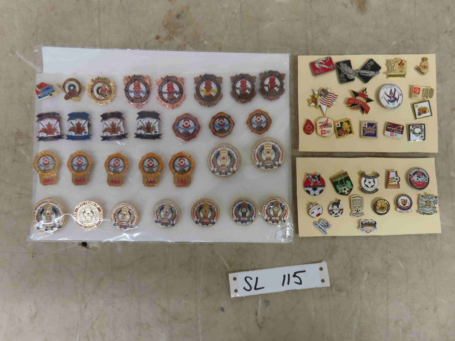 Large Canadian Firefighters Curling Champs 1987-2014 Pins, Provincial Soccer Pins, Olympic & Red Cross Pins