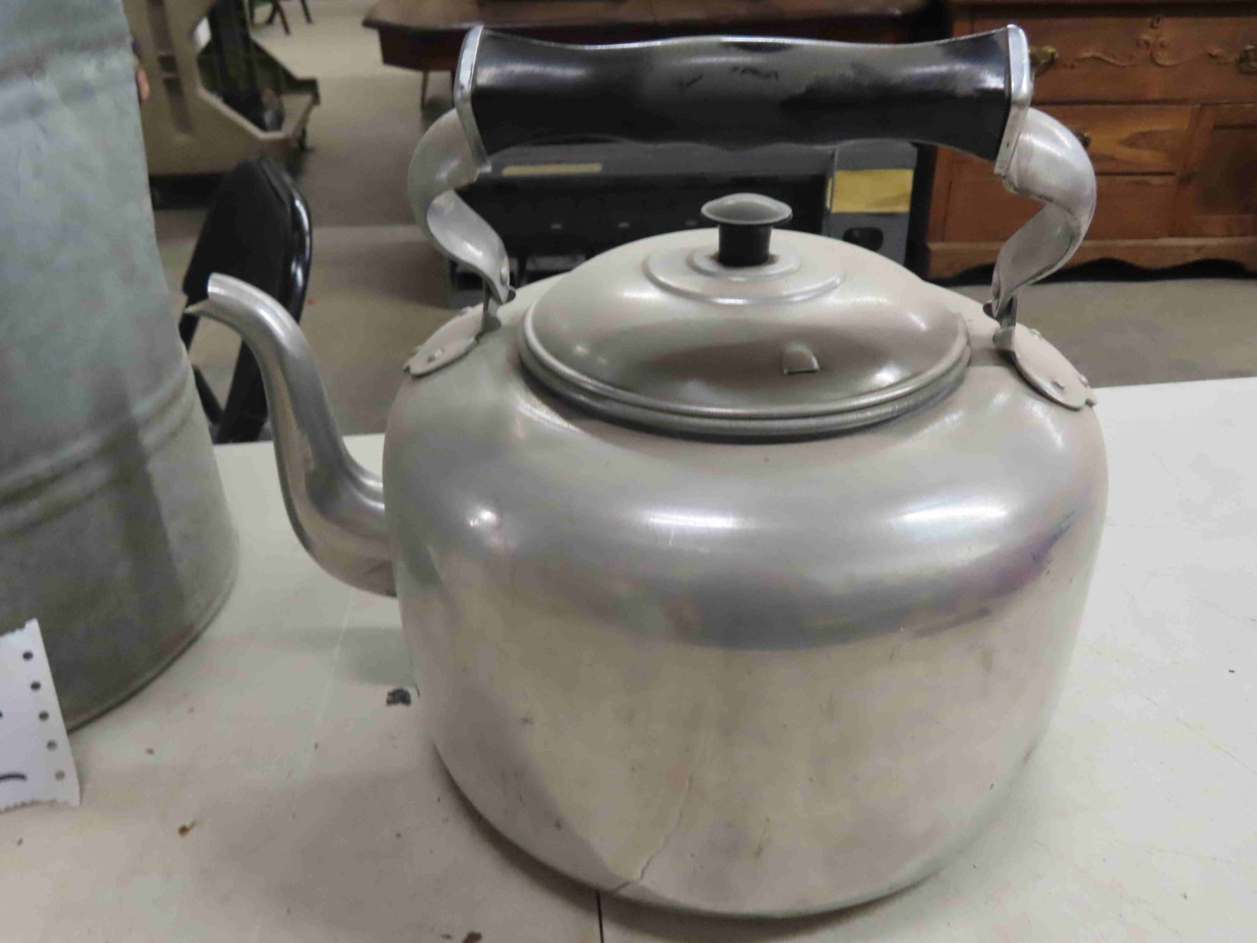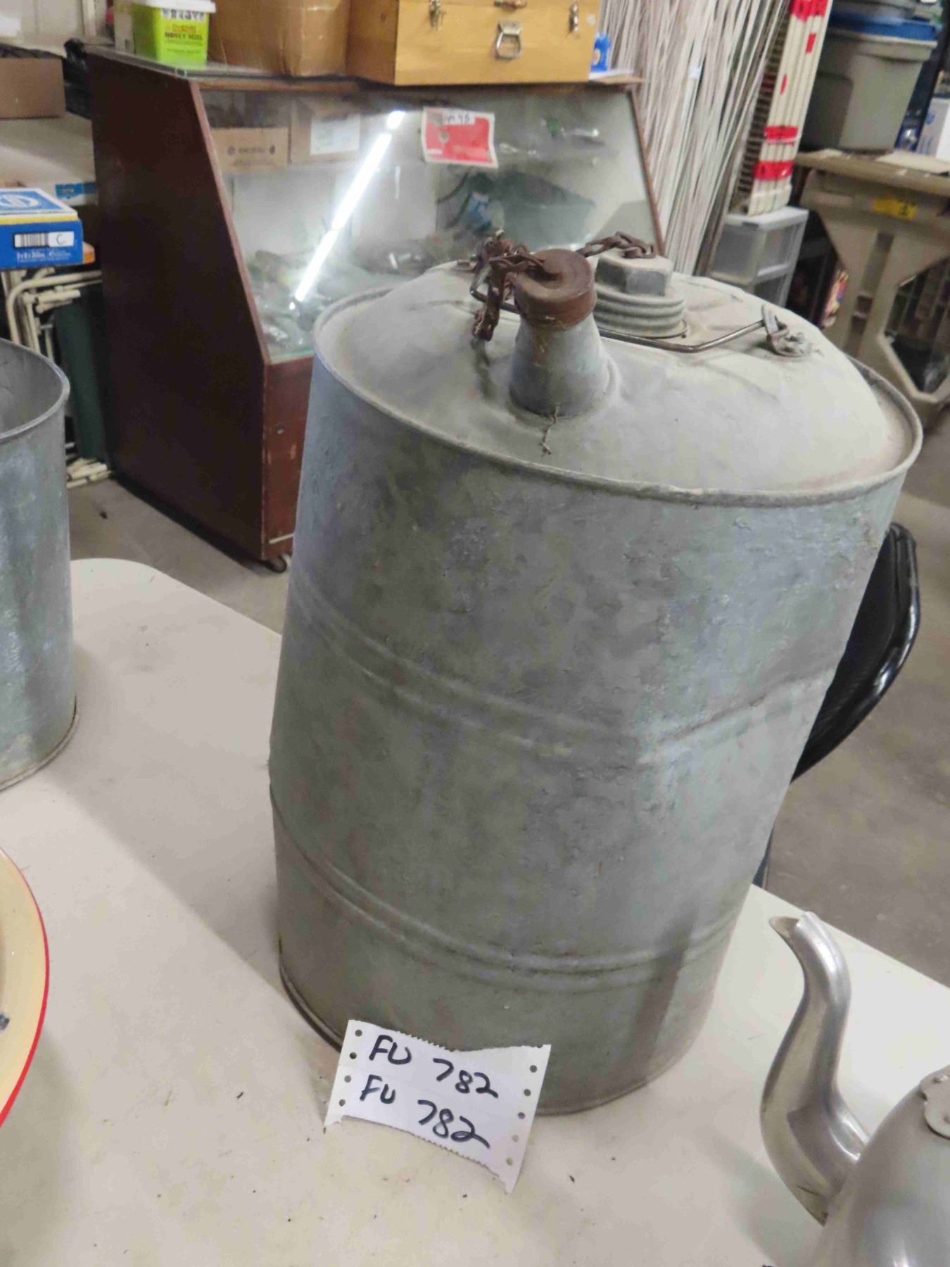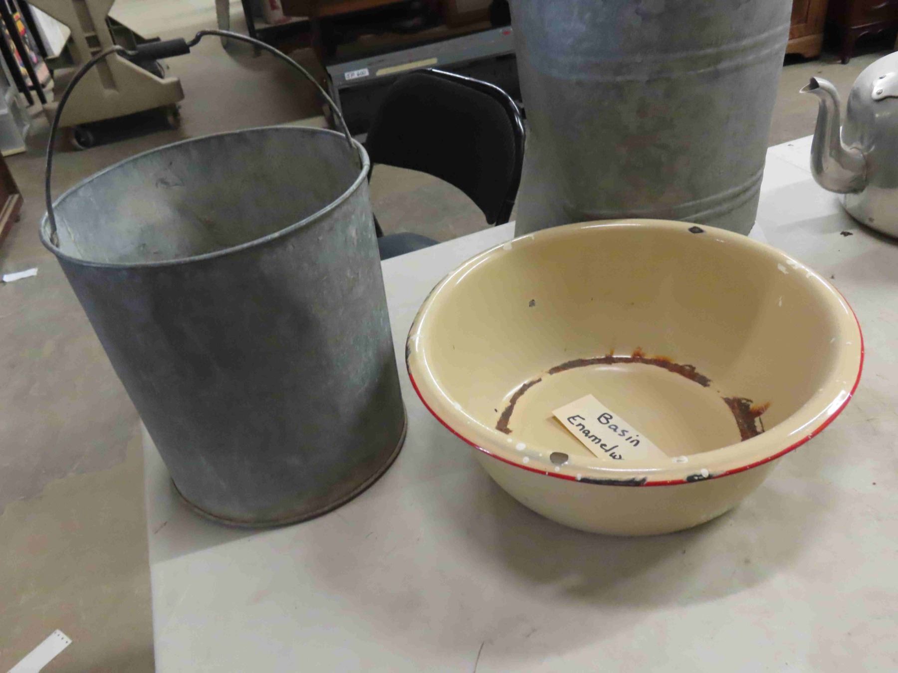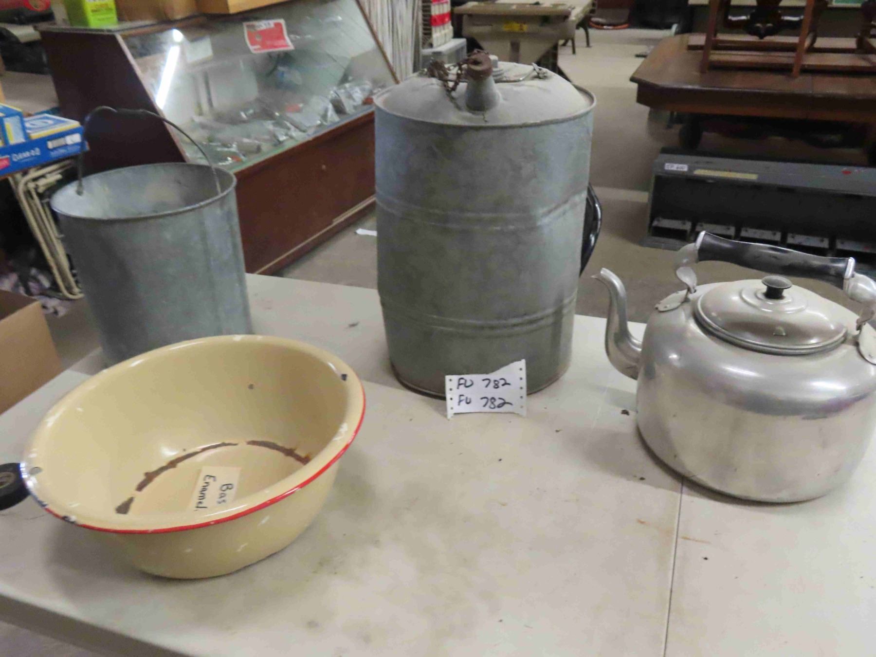 Large Kettle, Galvanized Gas Can, Enamel Basin, Galvanized Pail