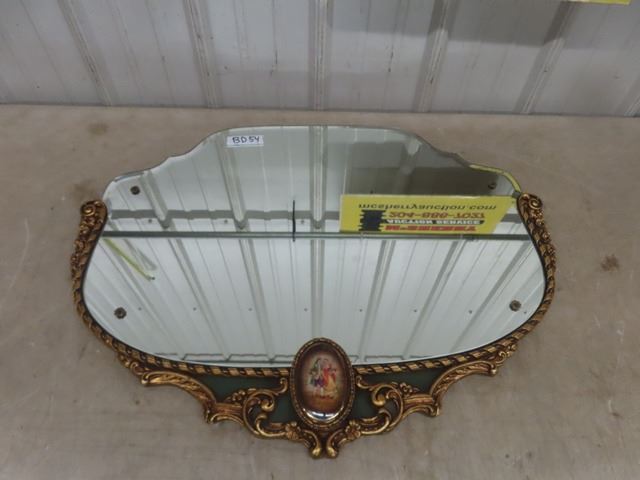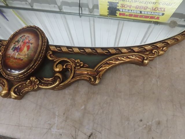 Large Vintage Heavy Plate Glass Mirror in Oak Frame with Gold Gesso Finish 24" x 31" - Fancy Victorian Medallion at Bottom - Excellent Condition