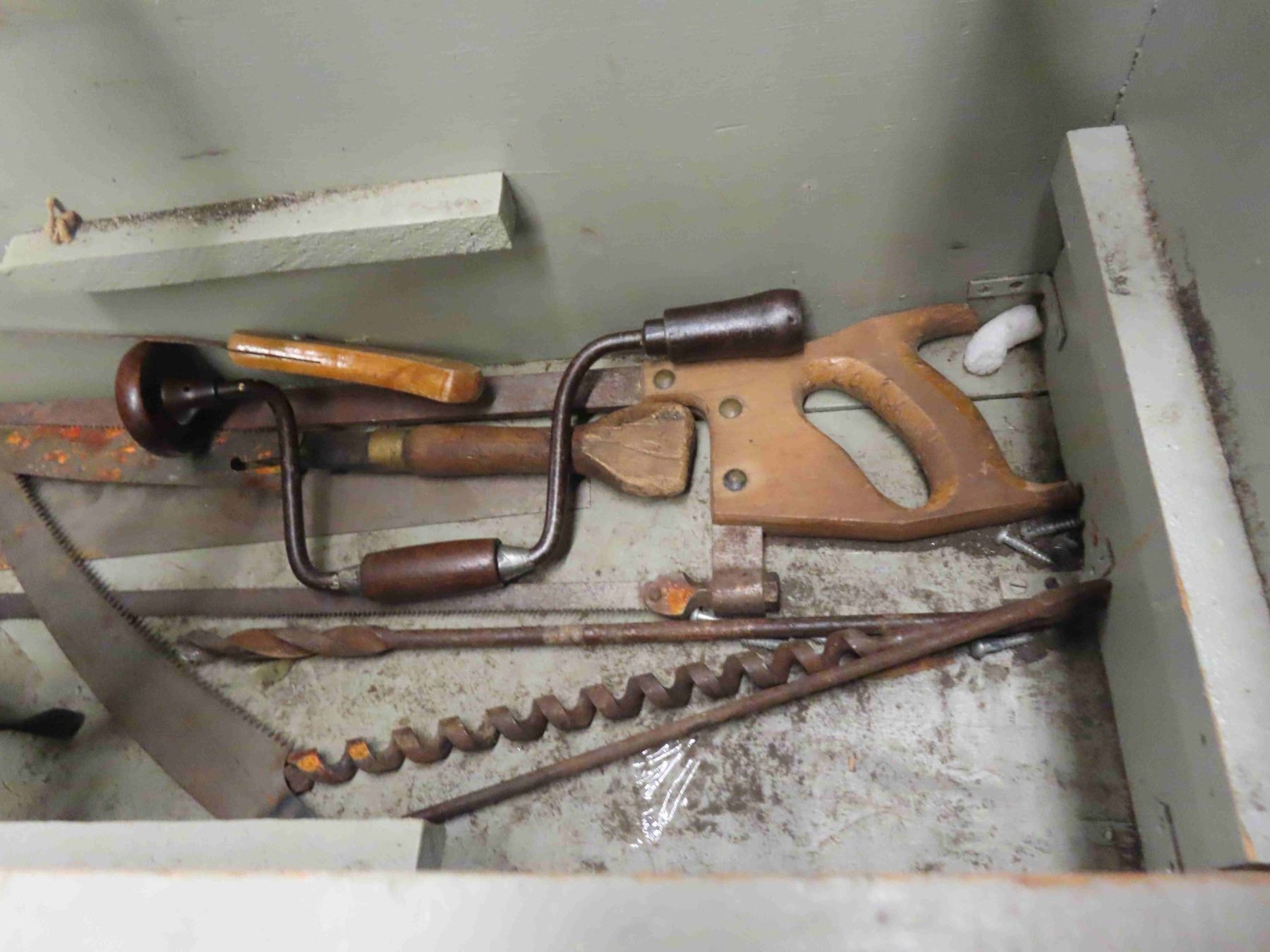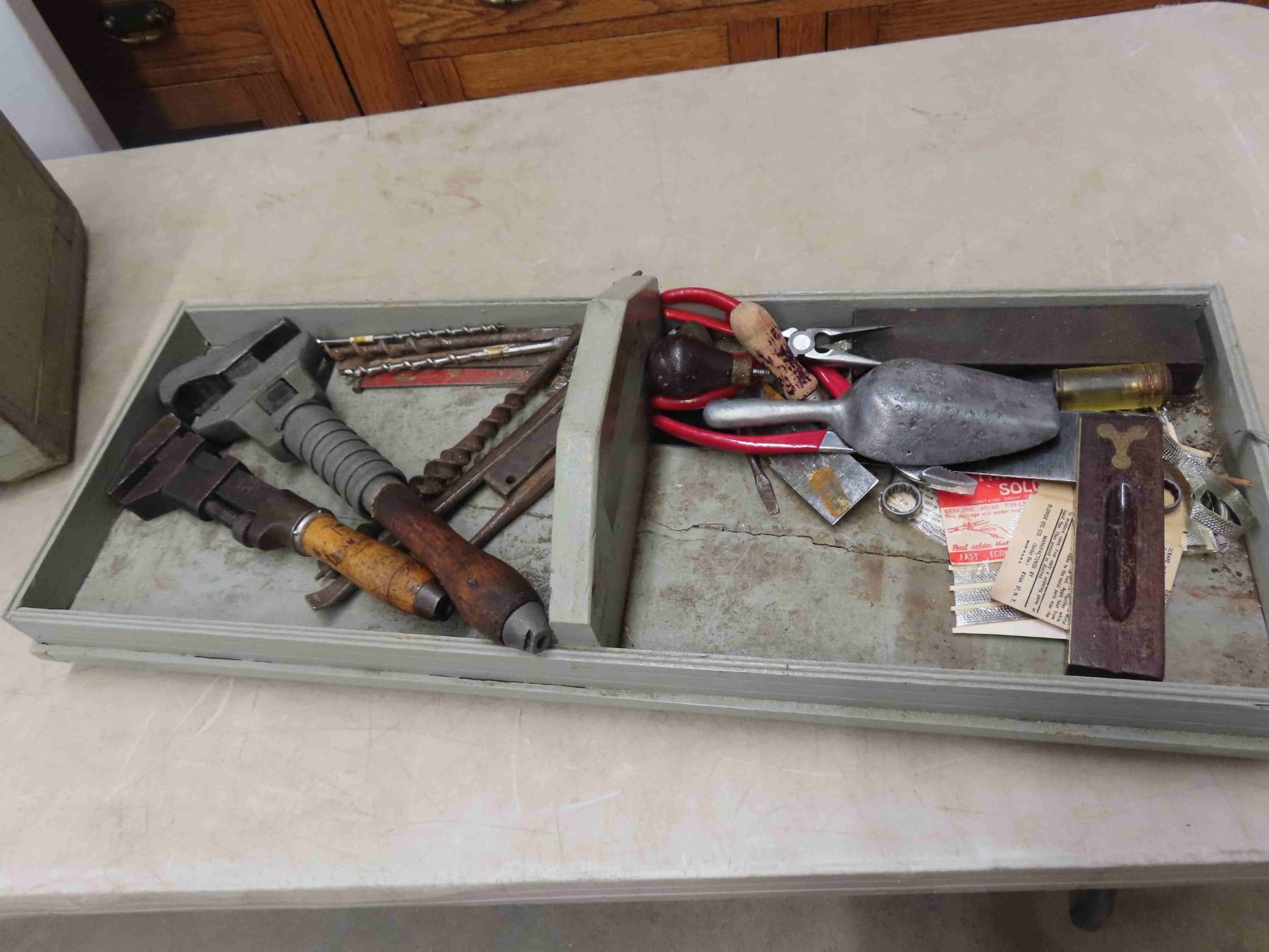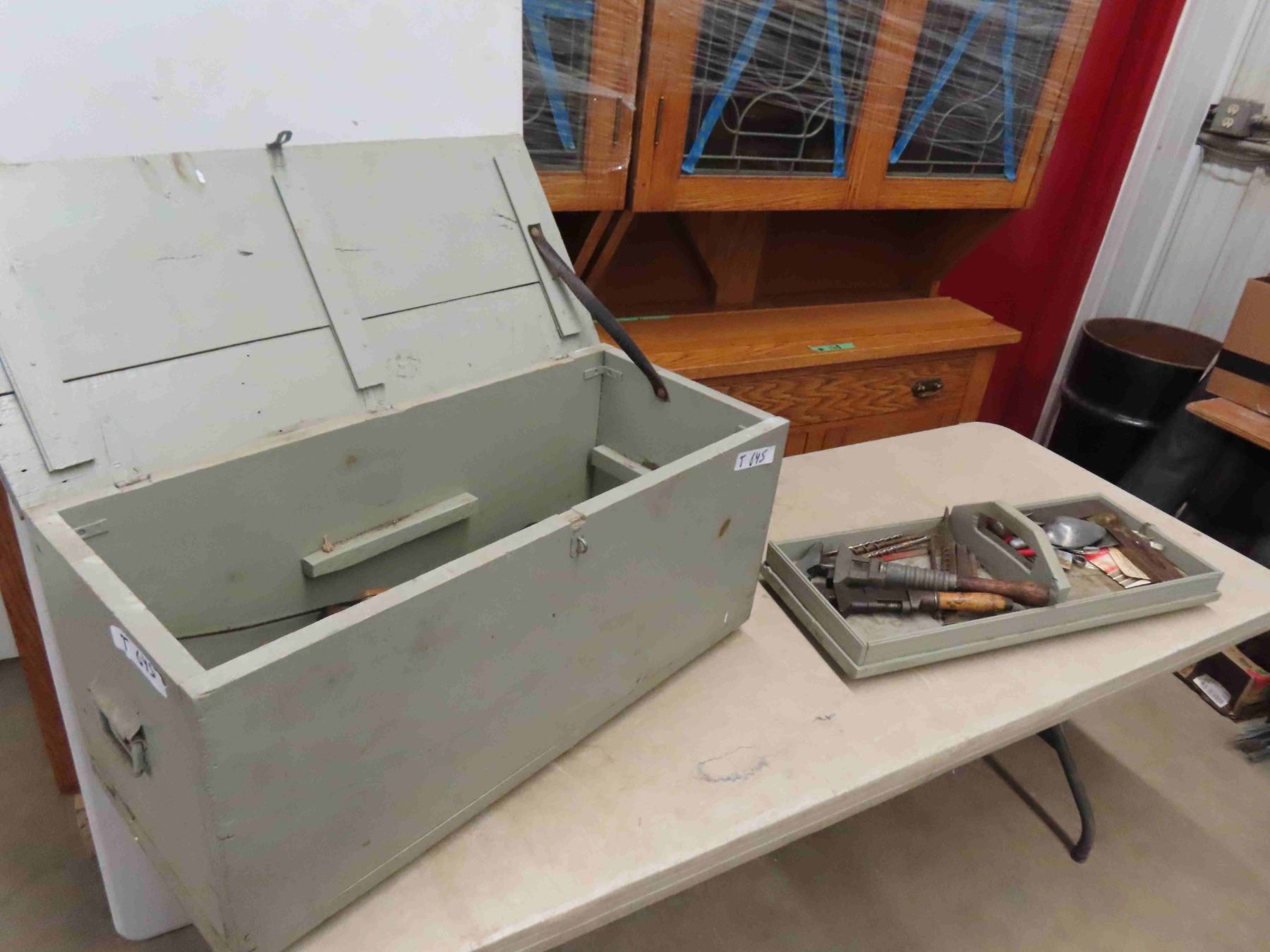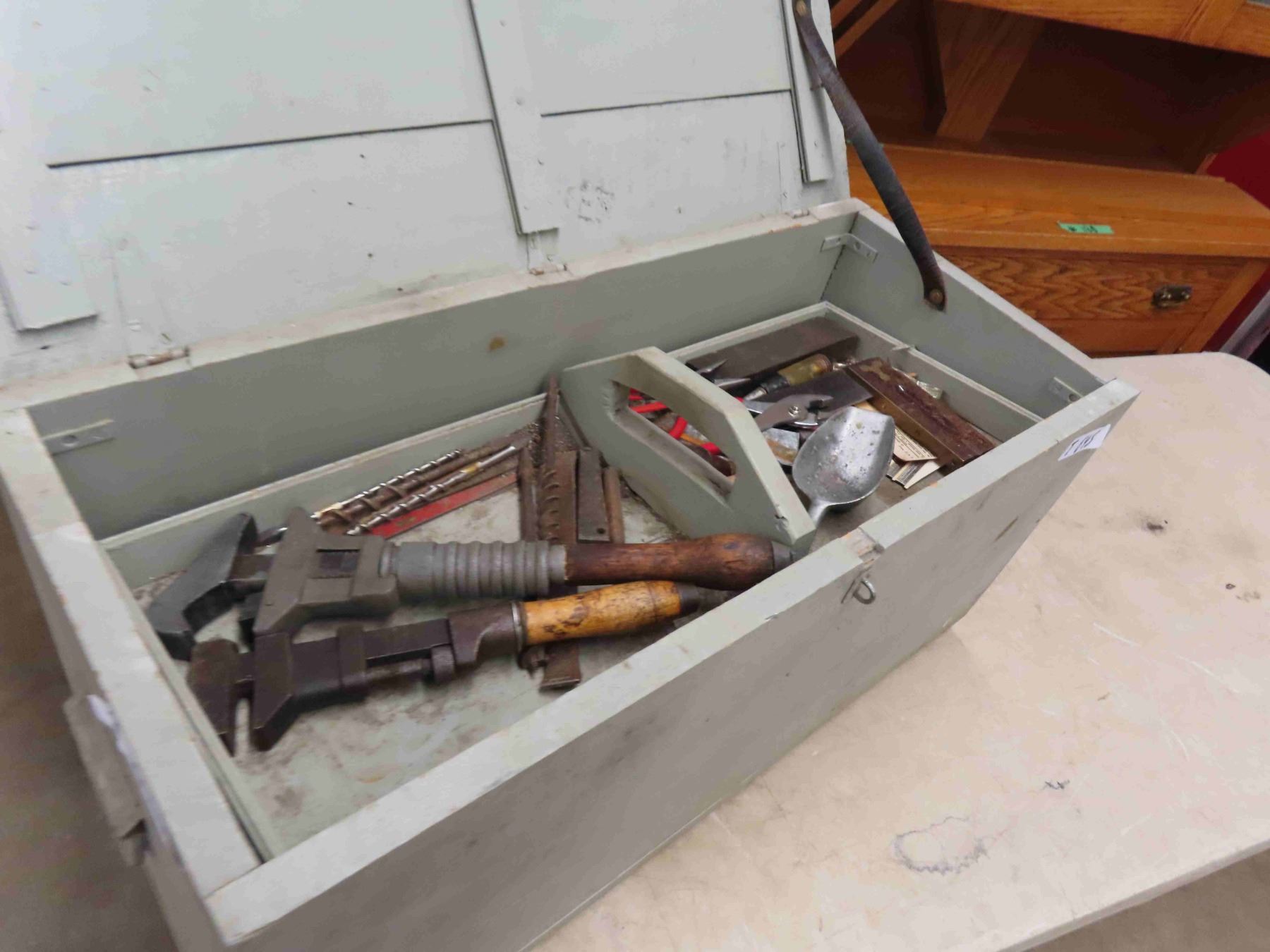 Large vintage antique wooden tool box with assortment of tools old and new.