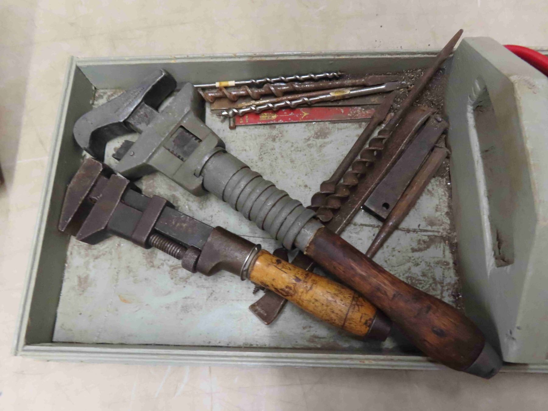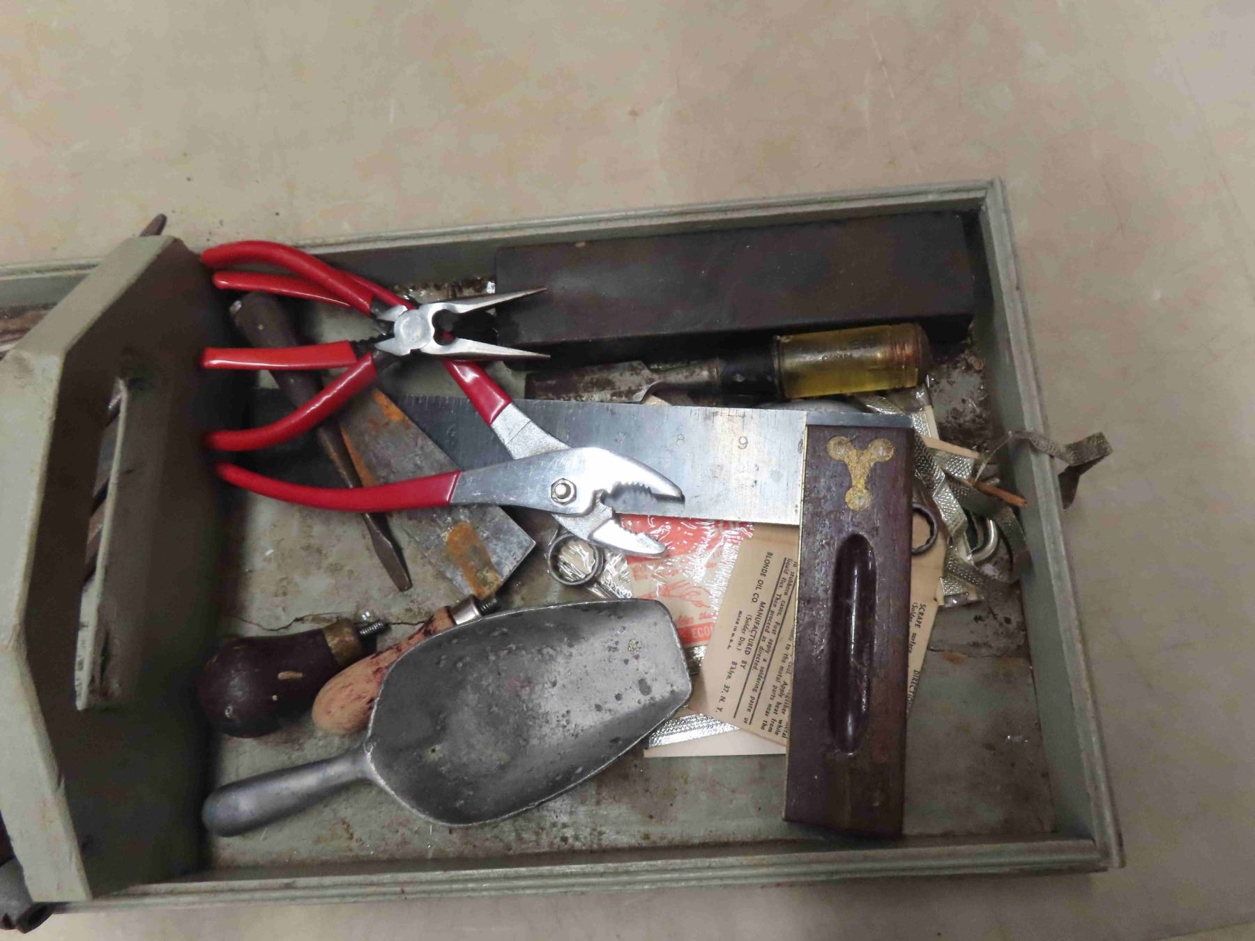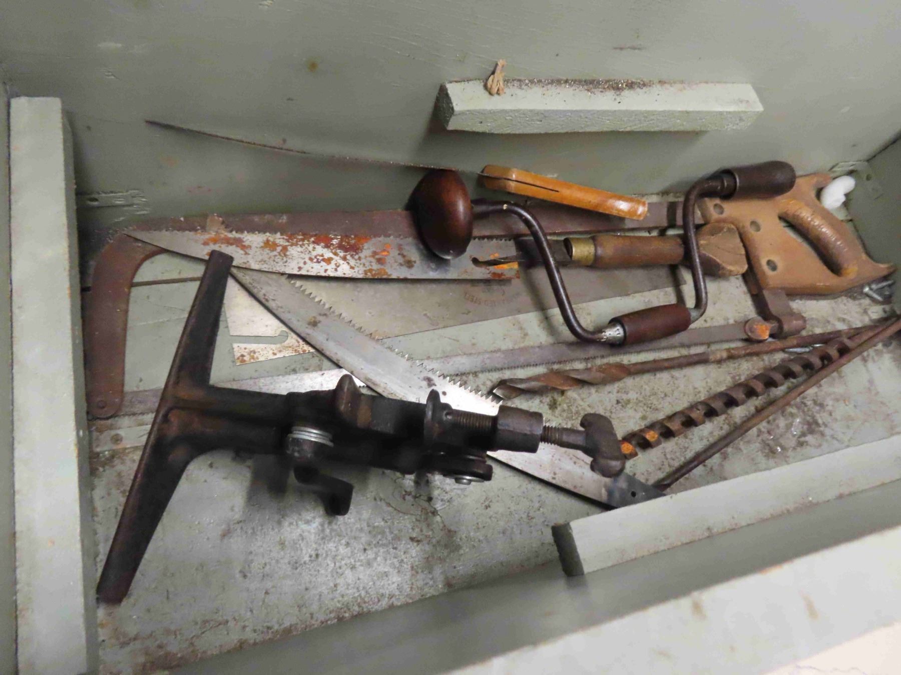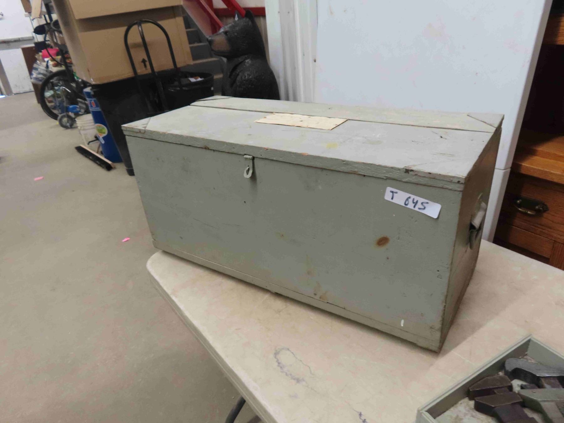Large vintage antique wooden tool box with assortment of tools old and new.