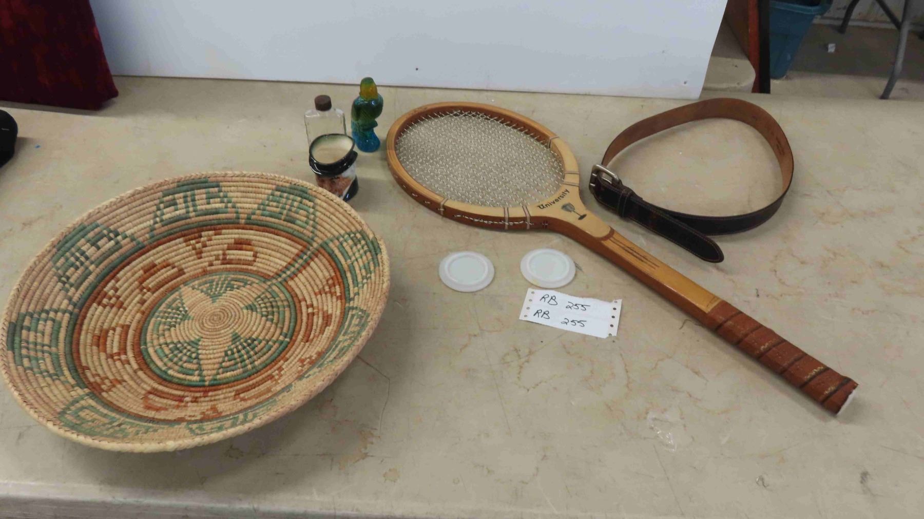 Leather Belt 36", Tennis Racket, Perfume Bottles, Tight Weaved Basket, Marutomoware