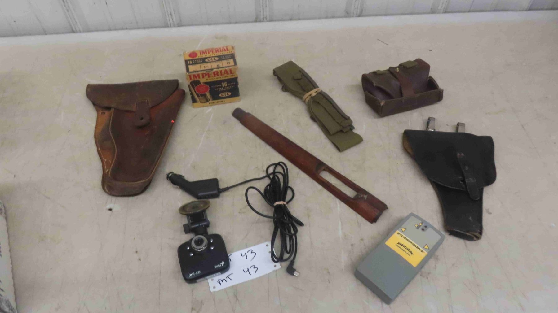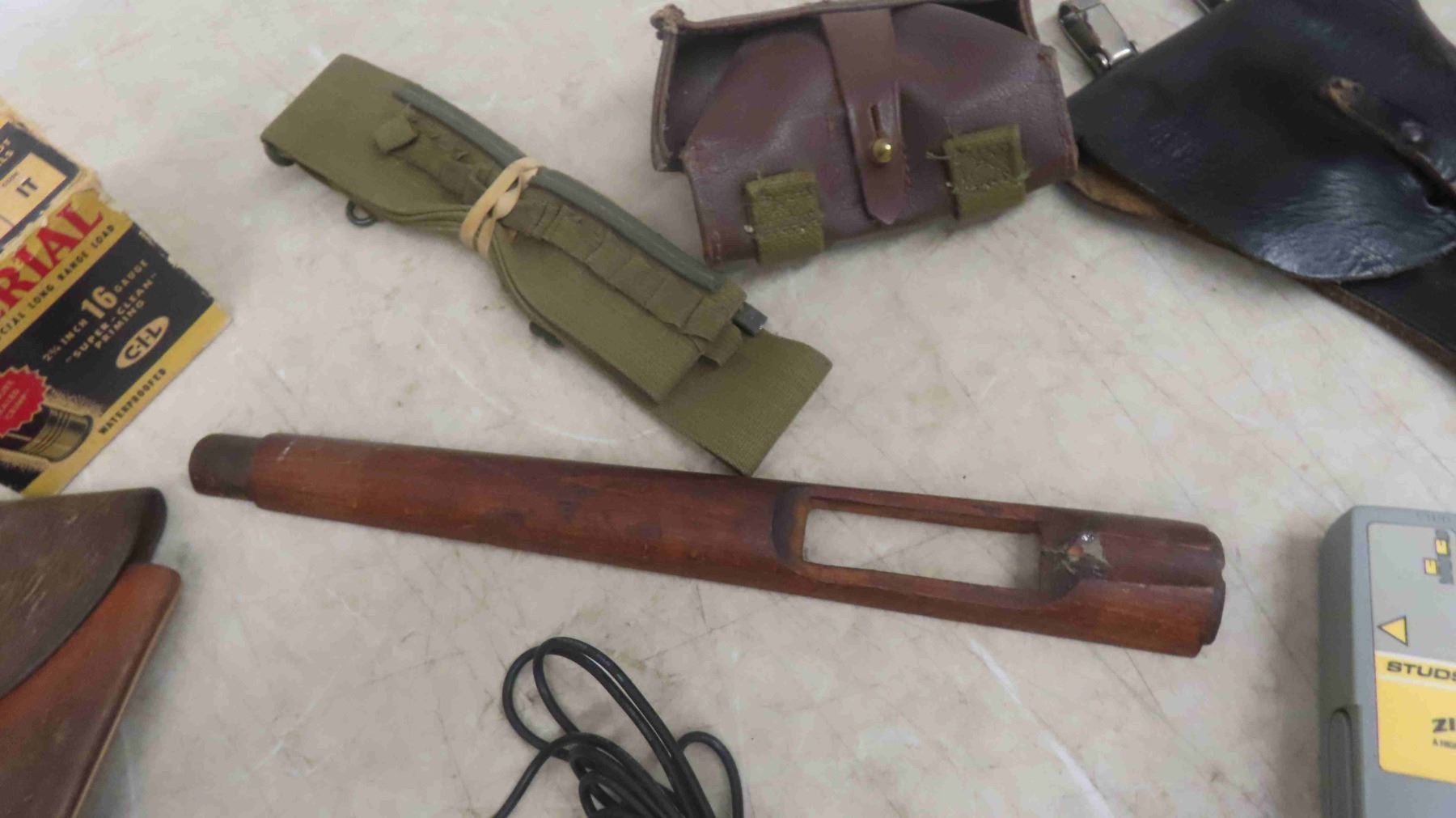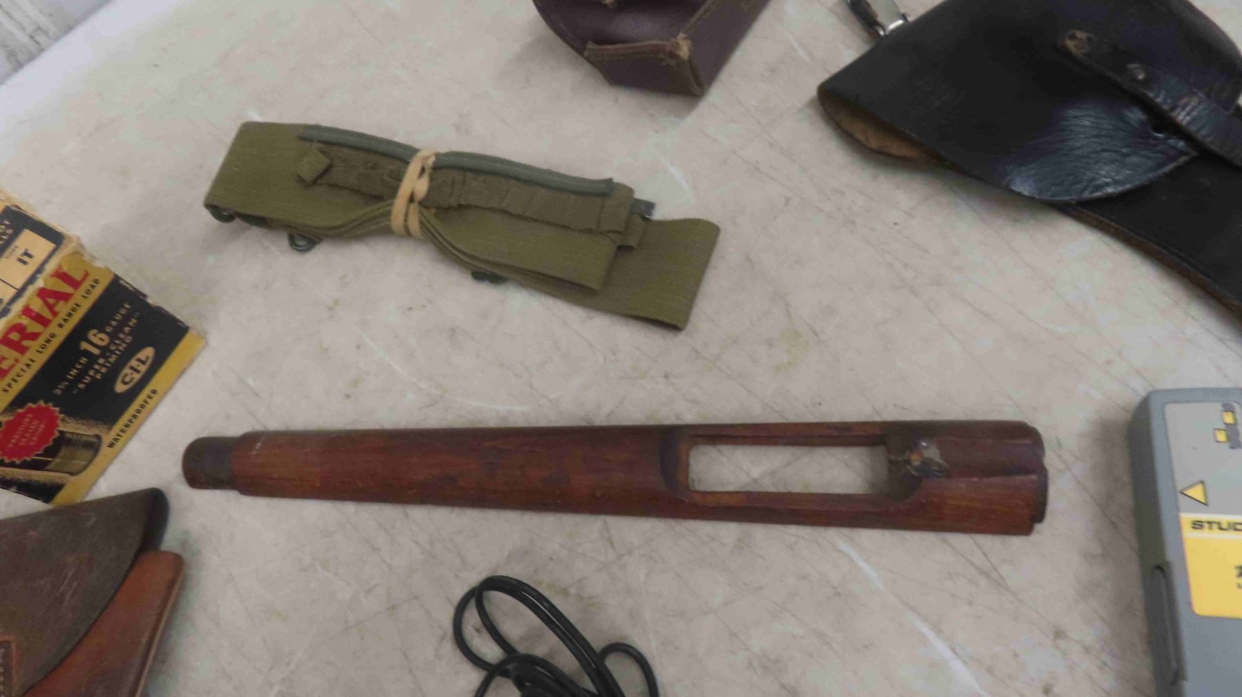 Leather Pistol Holster, Ammo Belt, GPS Stud Finder, Gun Force Arm Wood