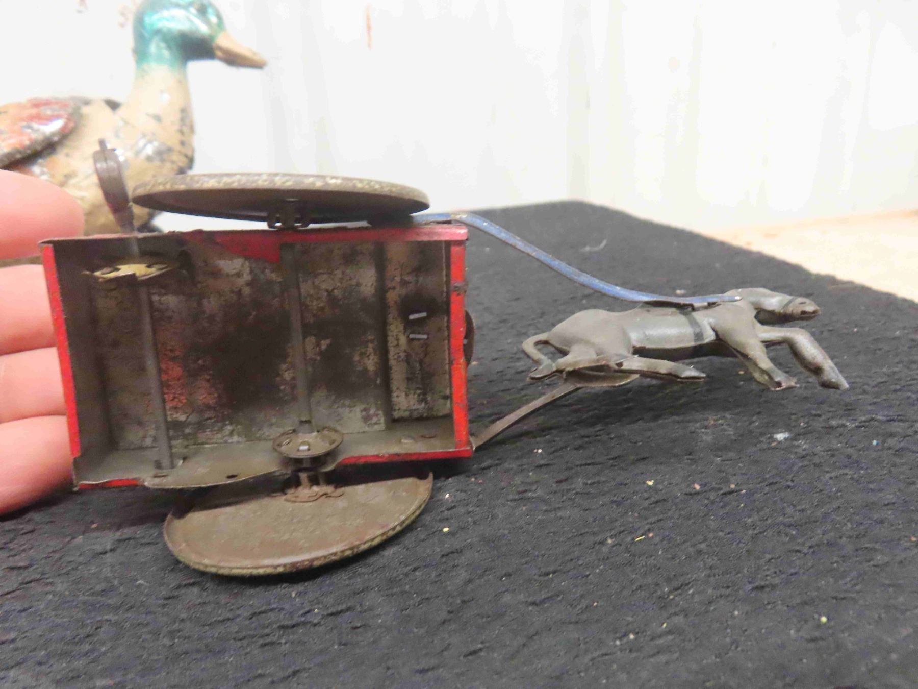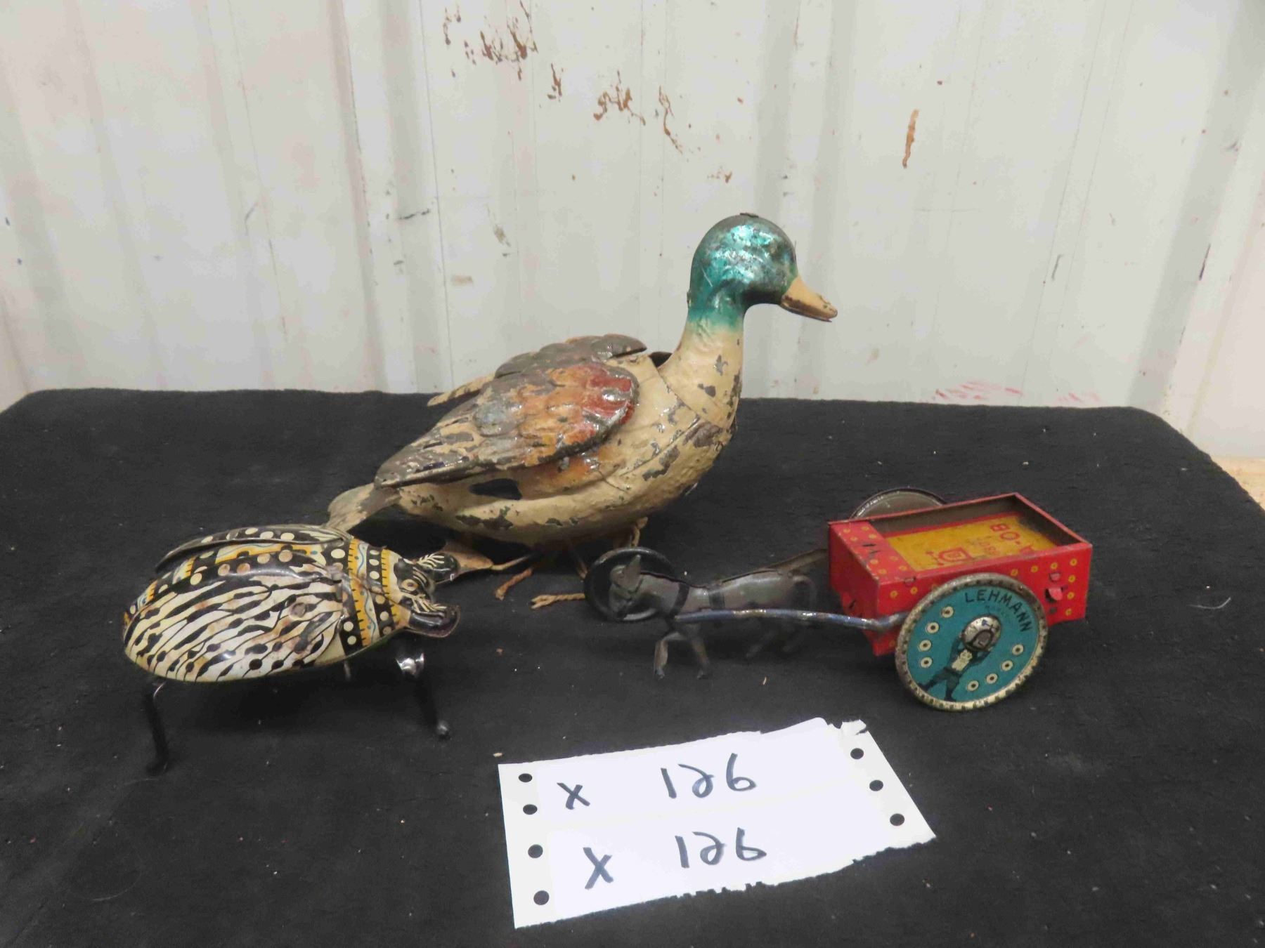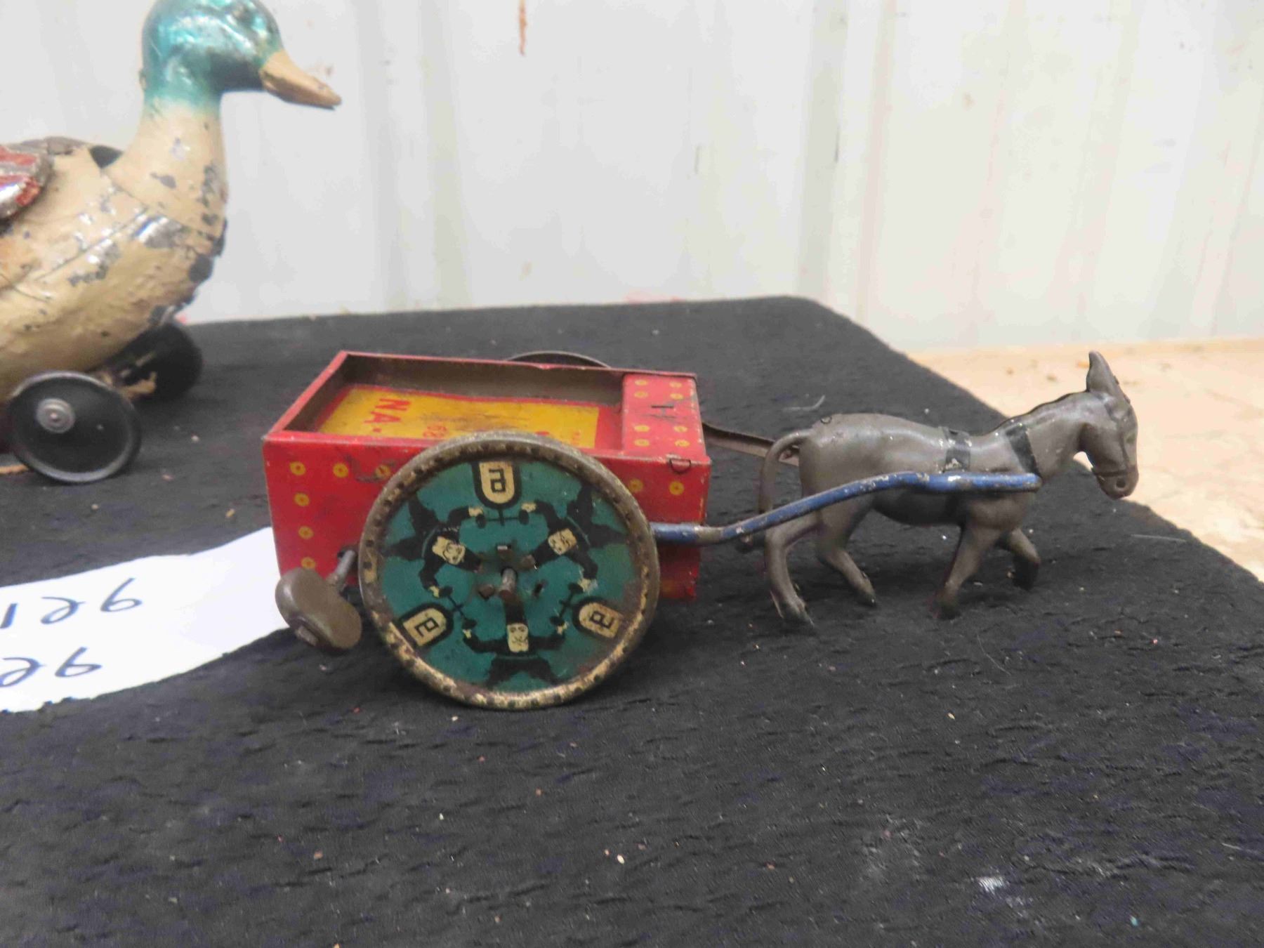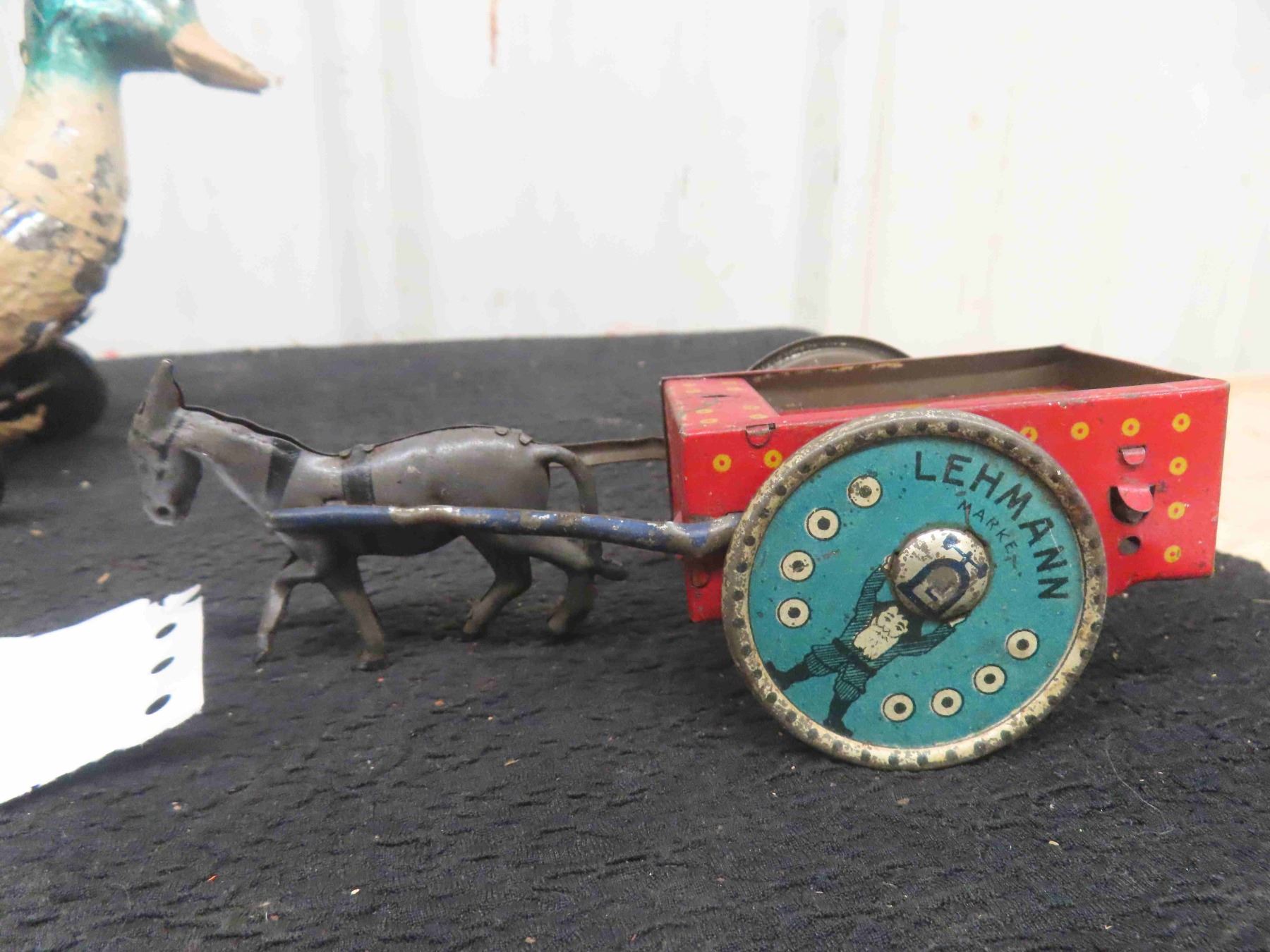Leham Donkey + Cart -Original Wind Up, Wind Up Tin Beetle, German Guntermann Duck 3" x 5" x 8"