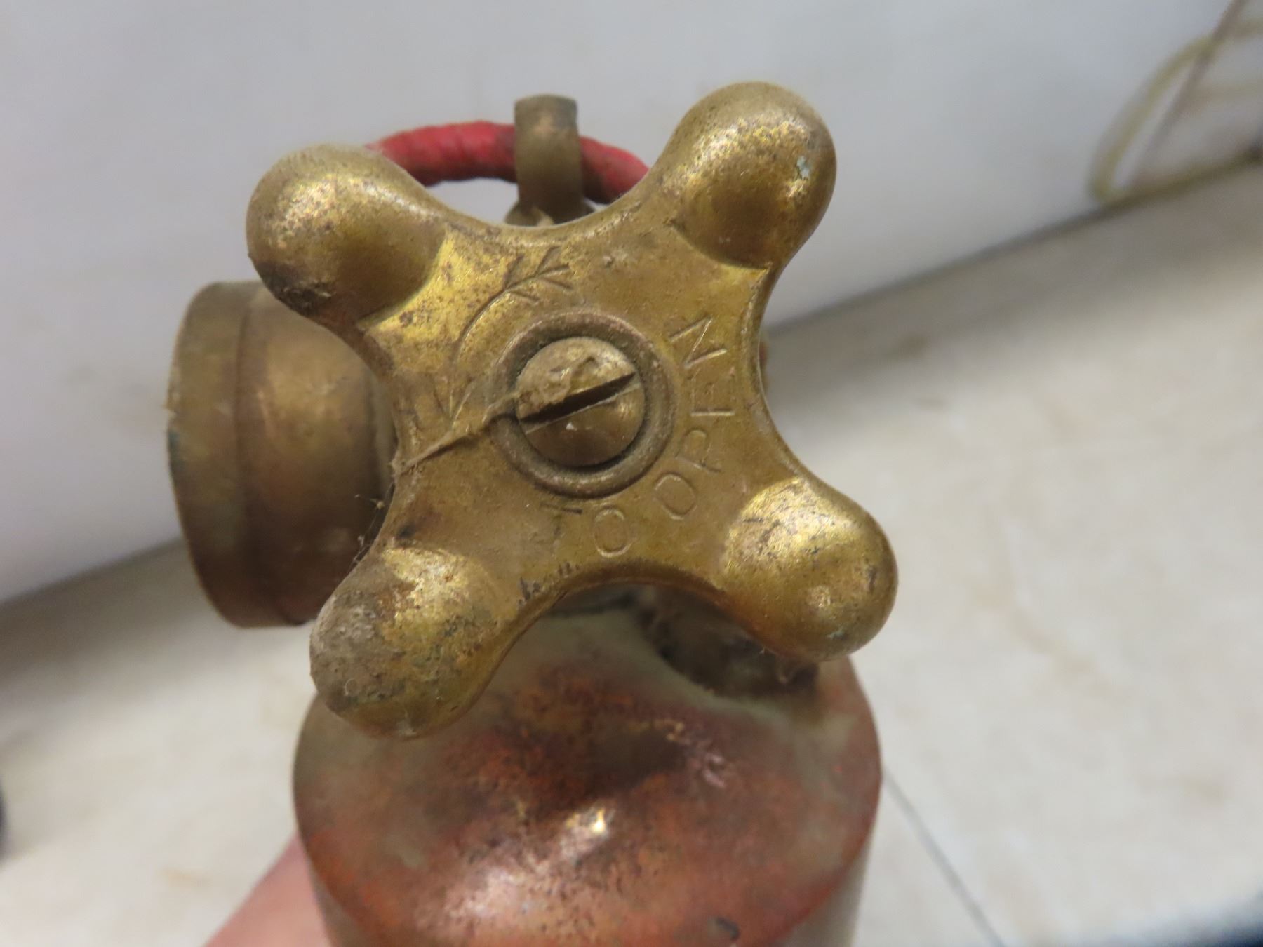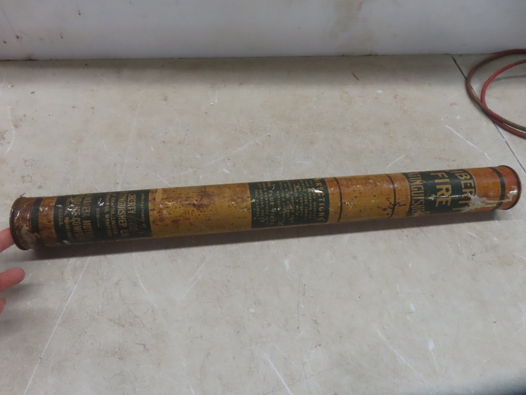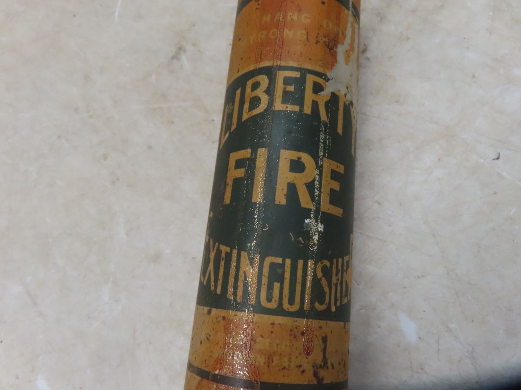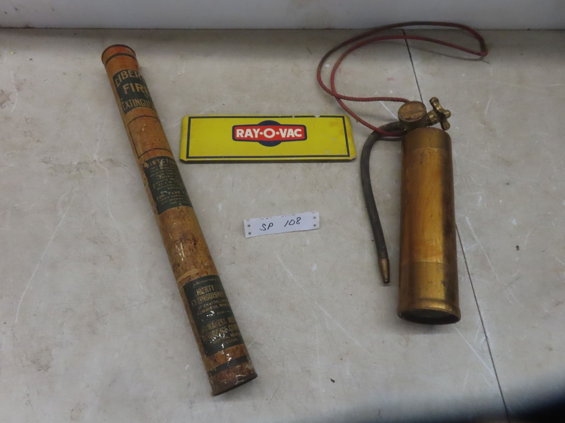 Liberty Fire Extinguisher, Ray -O- Vac Metal Sign 3 1/2"x11"+ Brass Fire Extinguisher