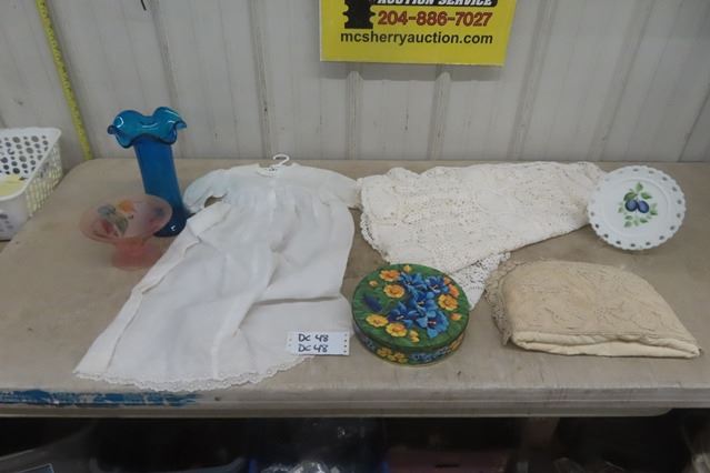 Linen Table Cloth, Children's Gown, Blue Glass Vase, Candy Dish, Plate with Plums, Head Rest Cover