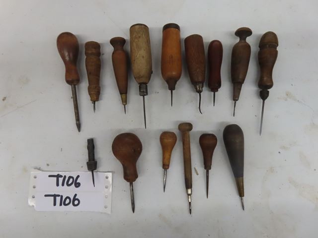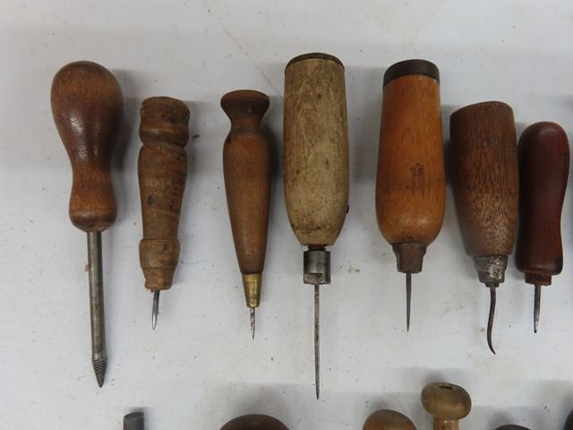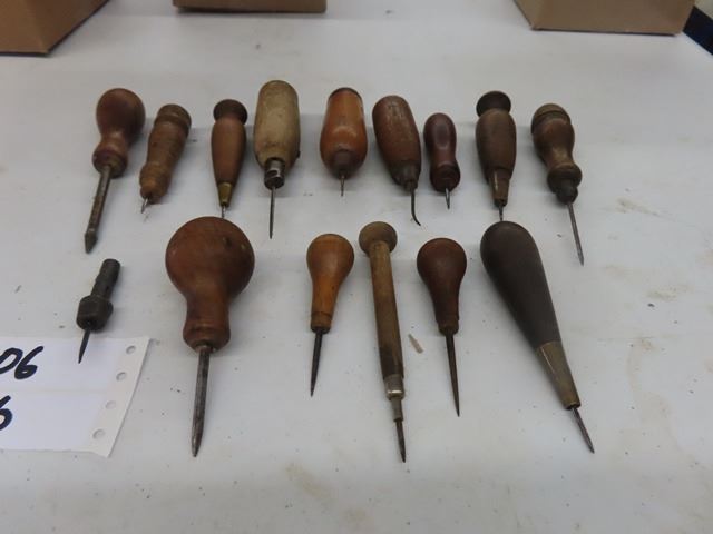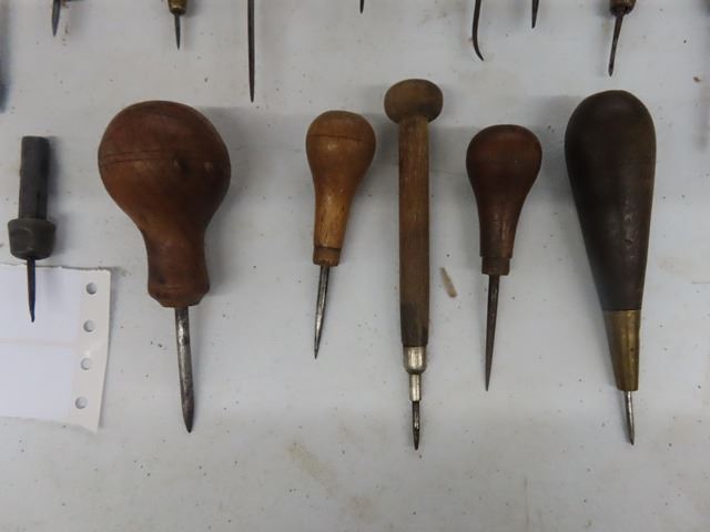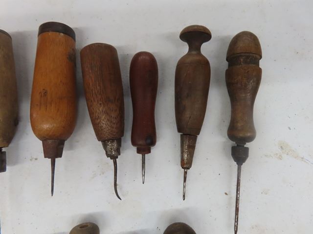 Lot of 12 Antique Vintage Awls for leather or wood working. There are many different varieties. There are no 2 identical. They are all in good usable condition or ready to be a most pleasant display. Cannot make out any makers marks.