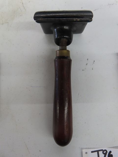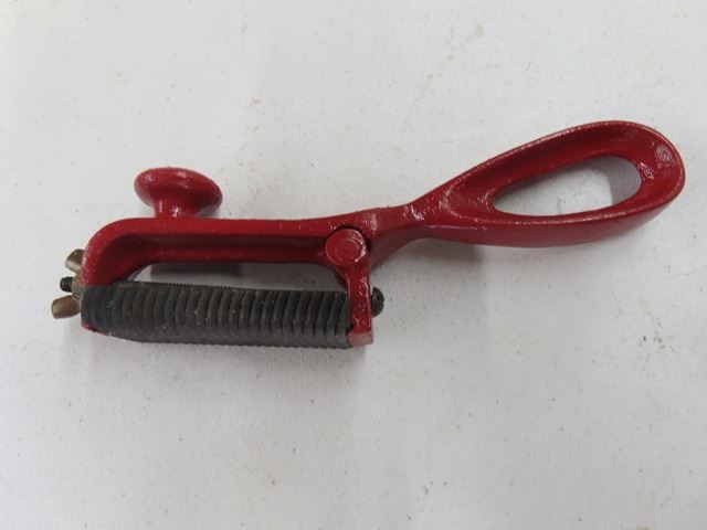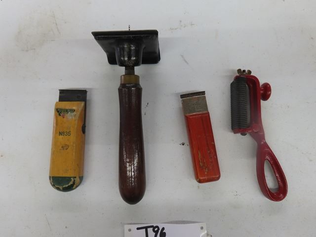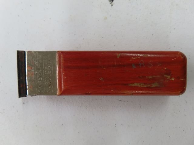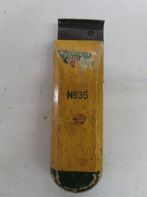 Lot of 3 Vintage Scrapers & 1 Rasp: Largest cabinet scraper is a RARE 8 ½" swivel head and made by E.C. Stearns and Co. of Syracuse N.Y.- Looks Hardly used + still has good blade & 2 smaller wooden scrapers are 5 ½ and 5” in length respectively. The smaller orange one is made by Rene Wable Hook No. 35 manufactured by Skarsten Mfg. Co. of London England. Patent No. 27-9-27. Larger yellow scraper is a No. 35 Miller Falls tools. Both of these wooden scrapers in good condition +have blade. Finally, there is a 7” steel rasp with interchangeable blades. It has been restored to brand new.