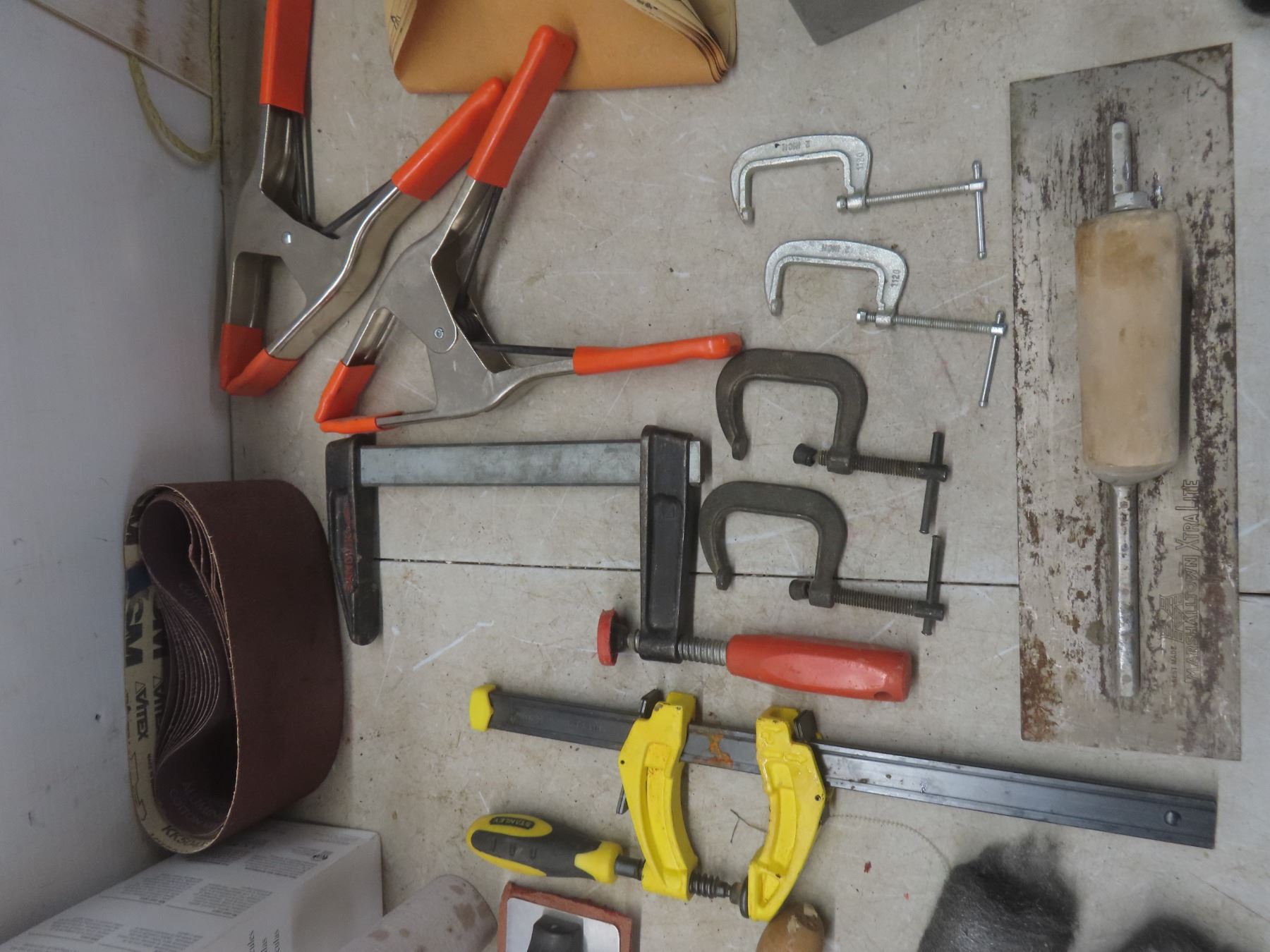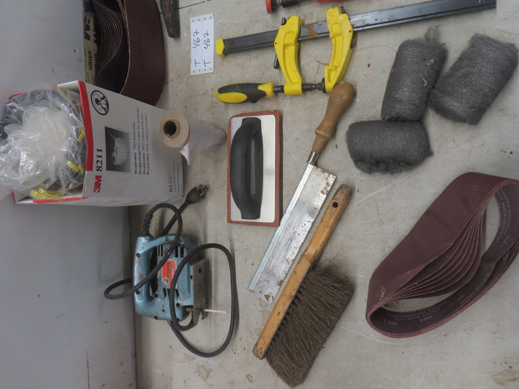 Lot of Finishing Equipment, Sandpaper, Clamps,Trowel,Jigsaw and More