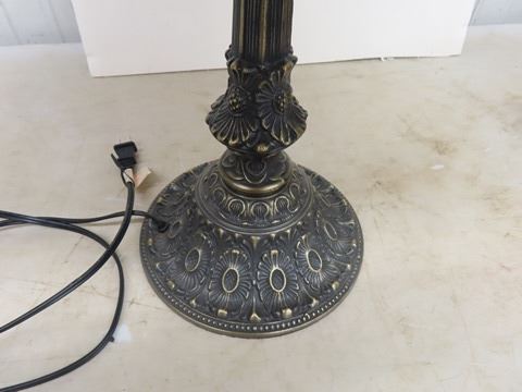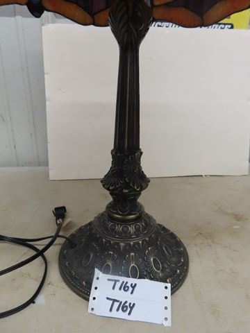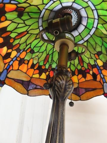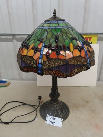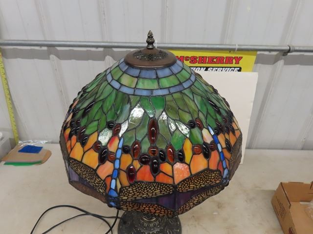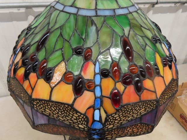 Lovely tiffany style lamp with stained glass & dragon fly motif. 16"L x 16"W x 23"H -This lamp is in very good condition . I am sorry to part with it. WOW!