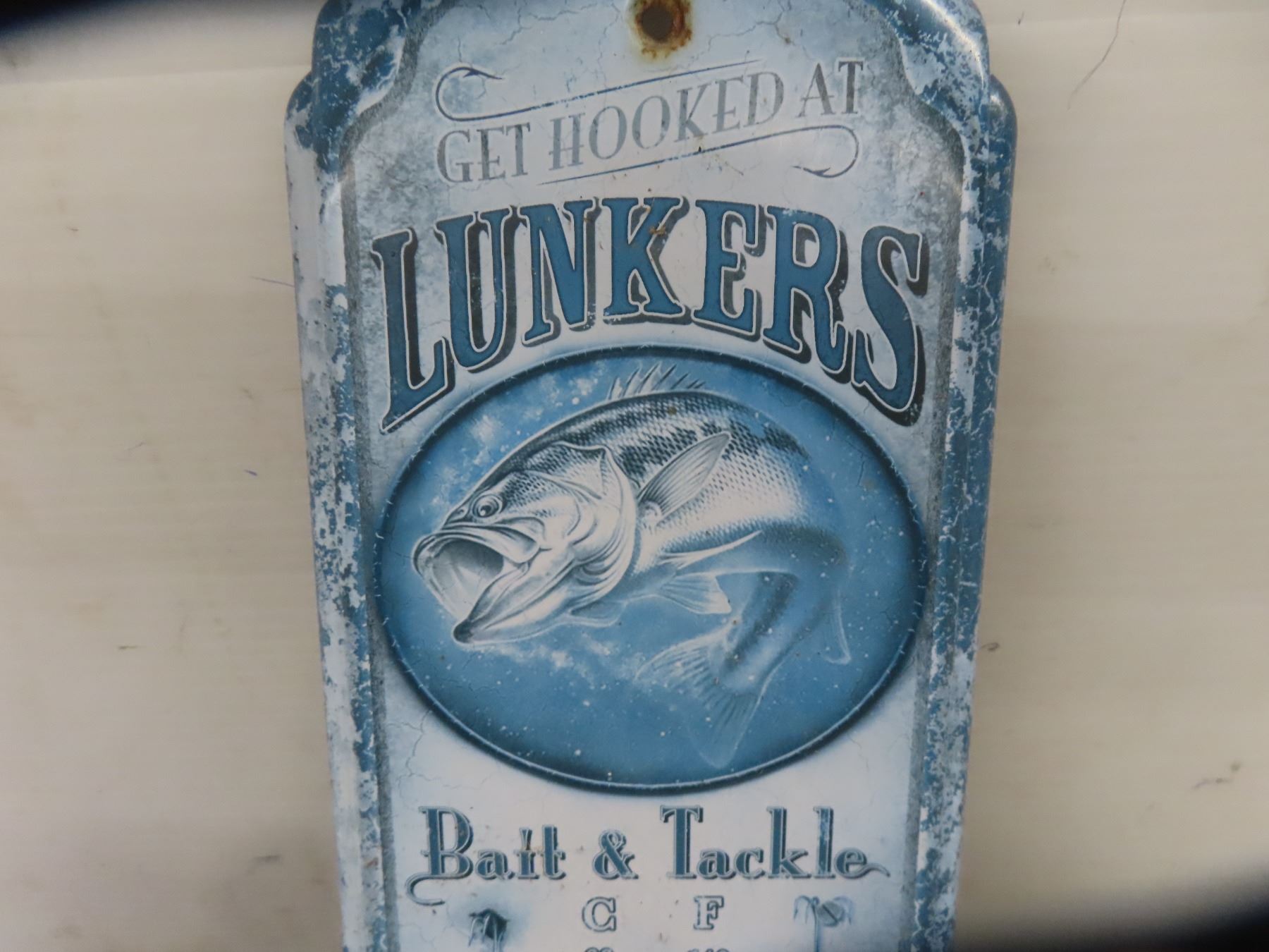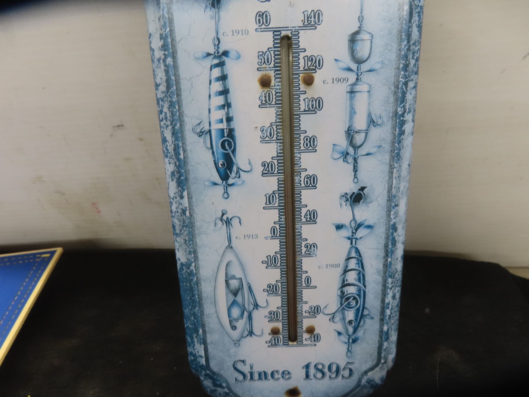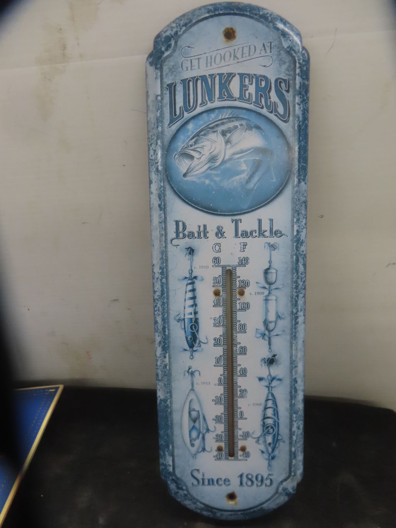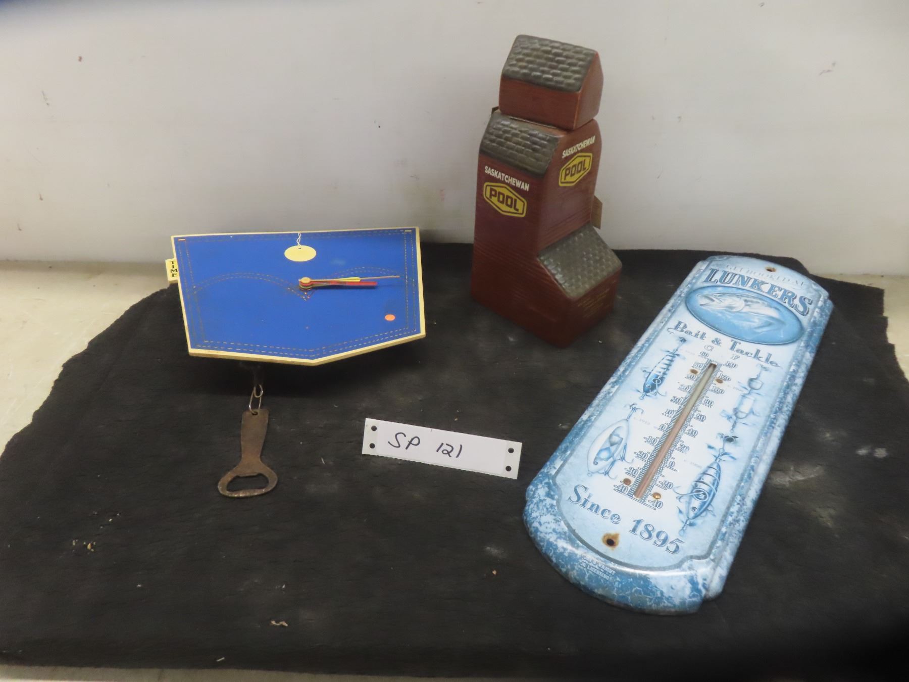 Lunkers Bait & Tables Thermometer 17" H, Saskatchewan Pool Decanter and Time Clock