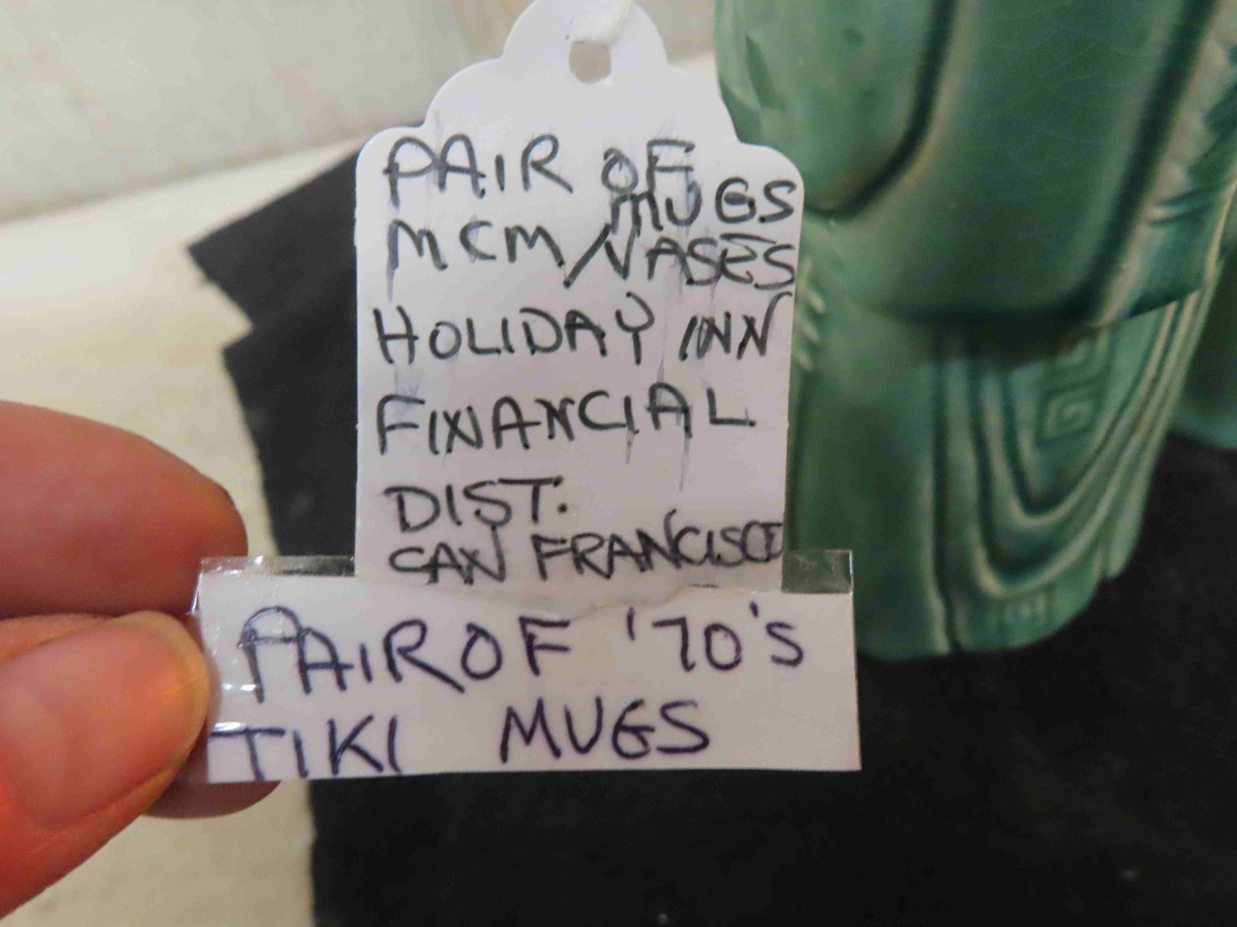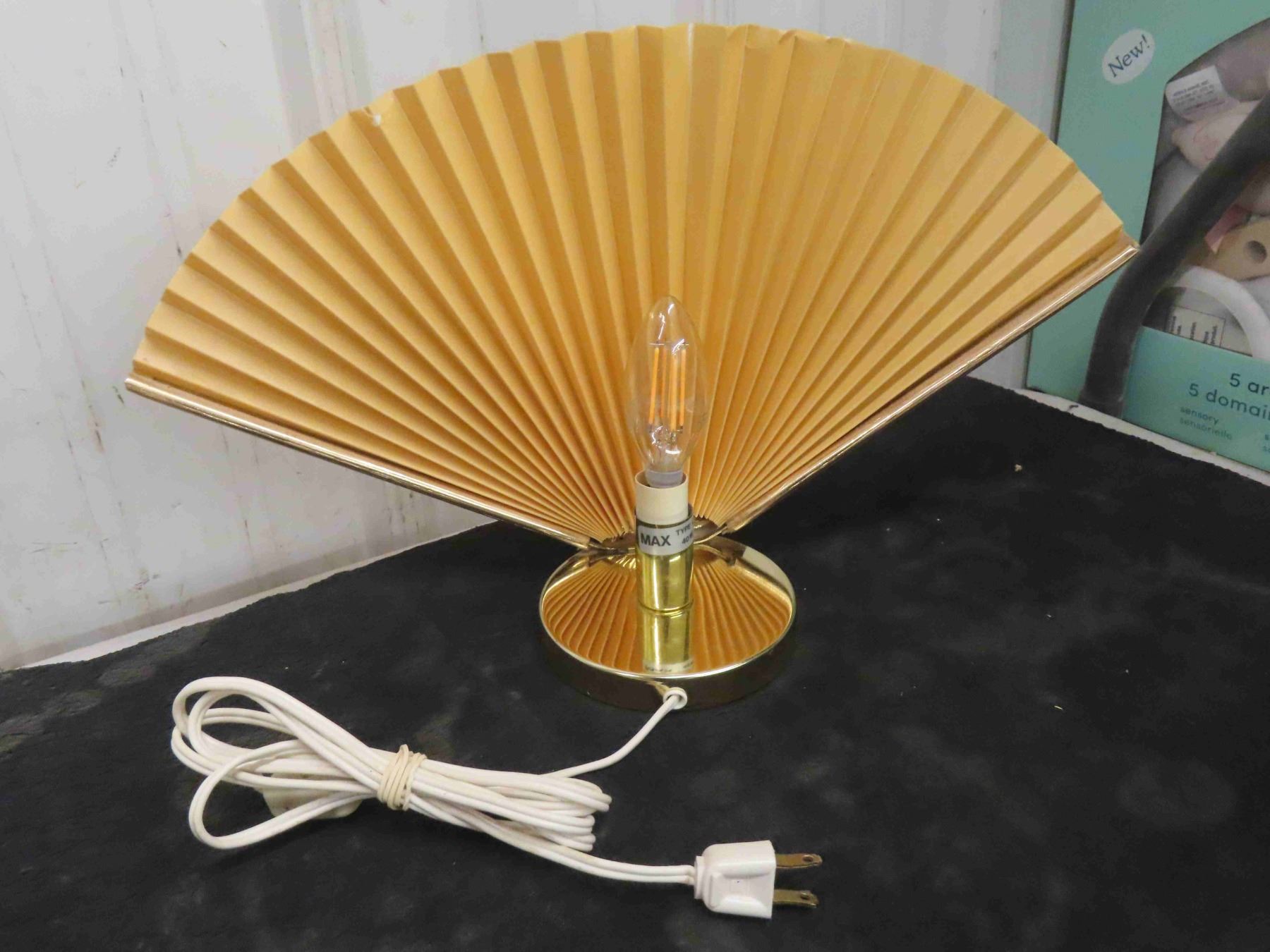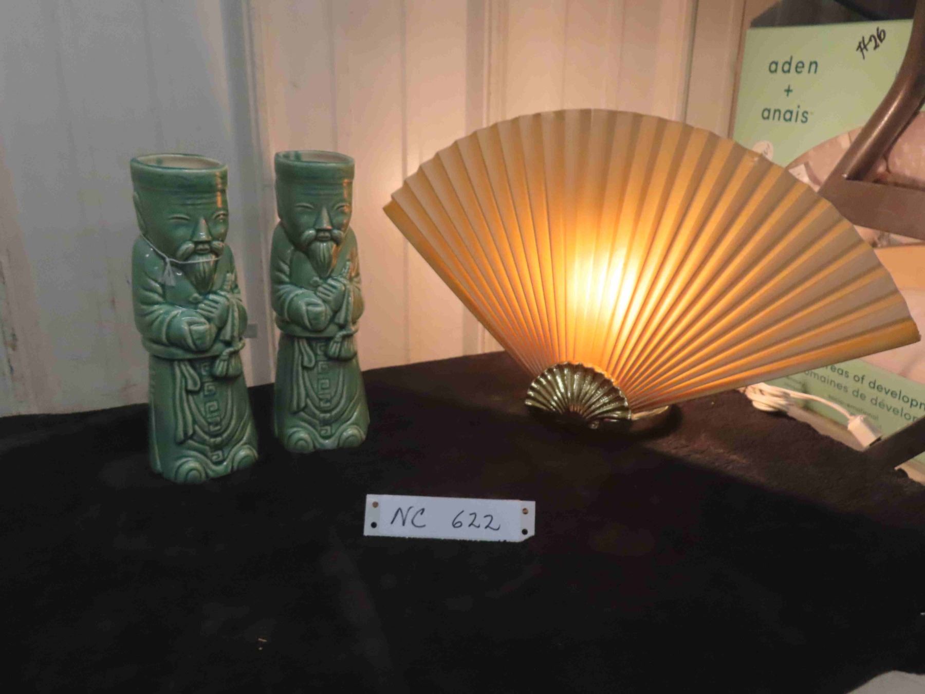 MCM clam shell ruffled shade lamp 1960s with new LED bulb, 1970 tiki mugs and vases, asian figurines
