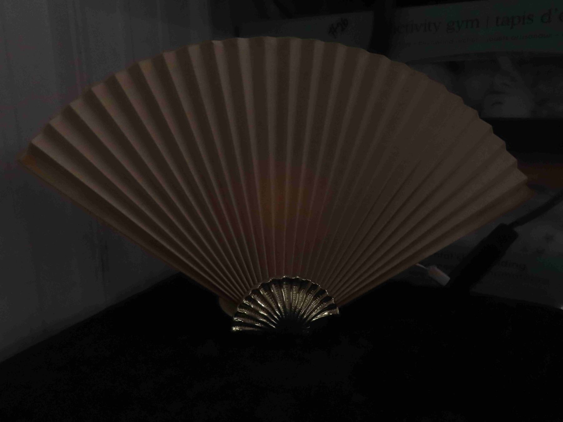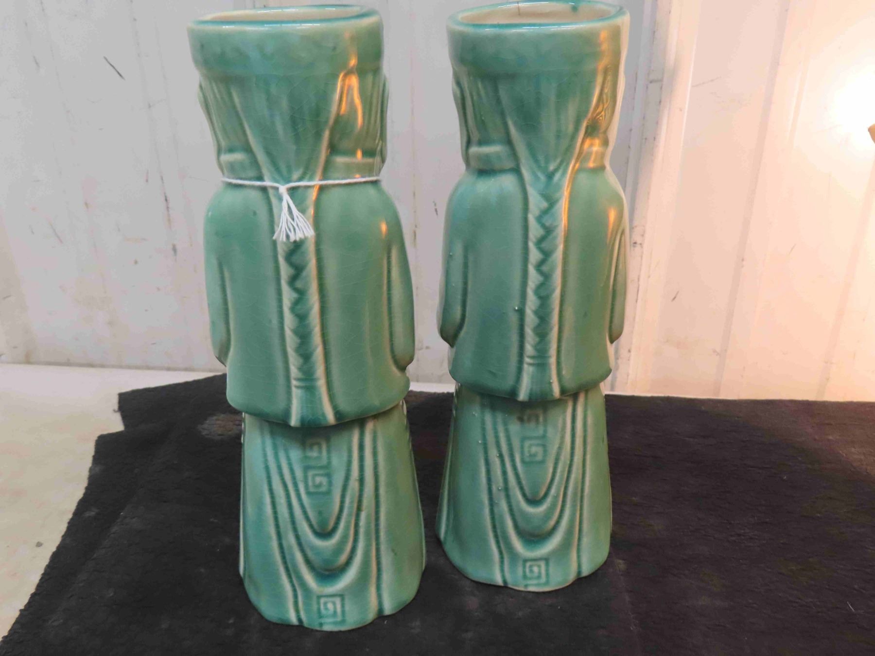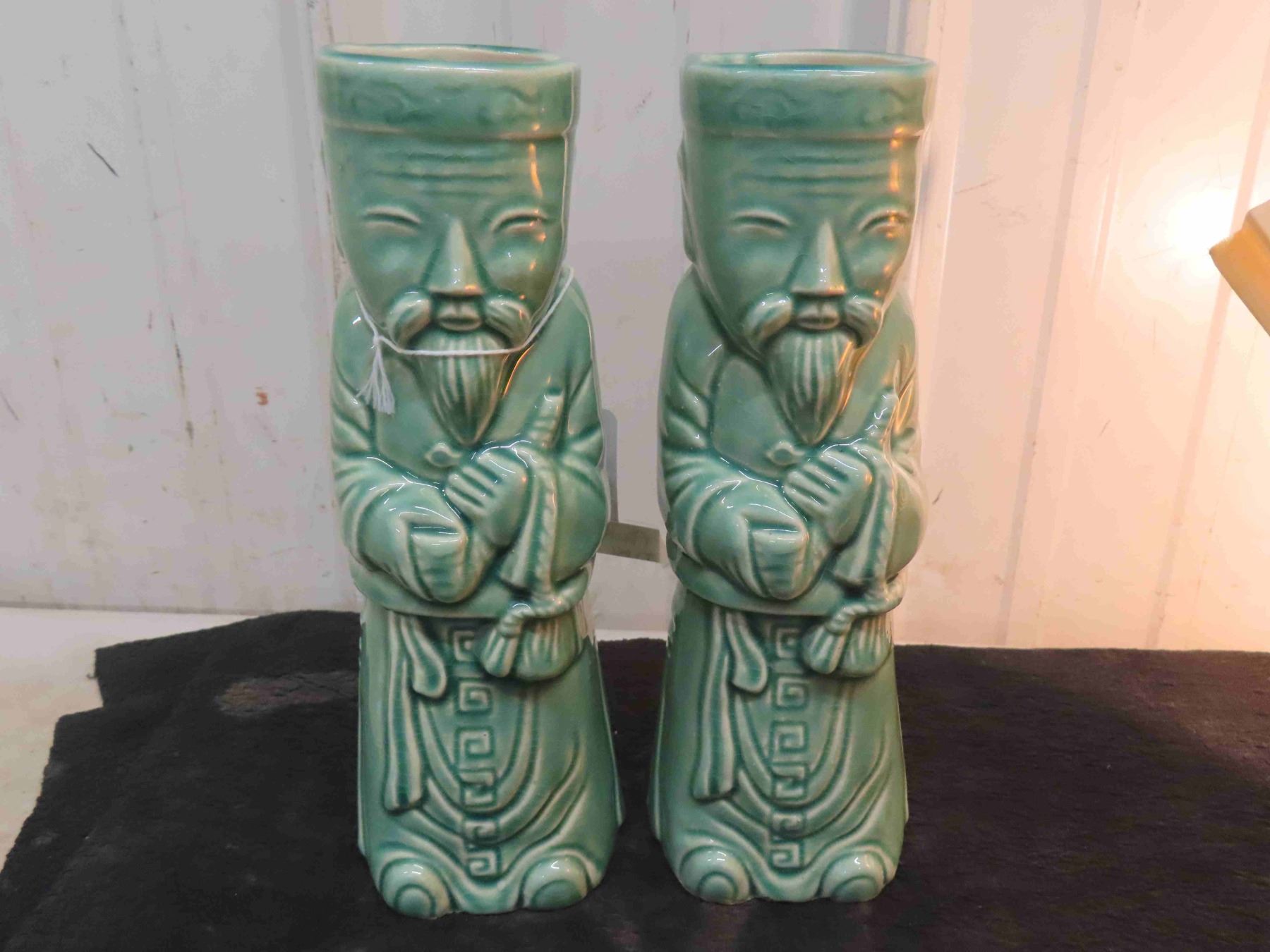 MCM clam shell ruffled shade lamp 1960s with new LED bulb, 1970 tiki mugs and vases, asian figurines