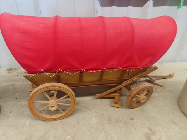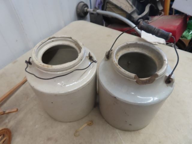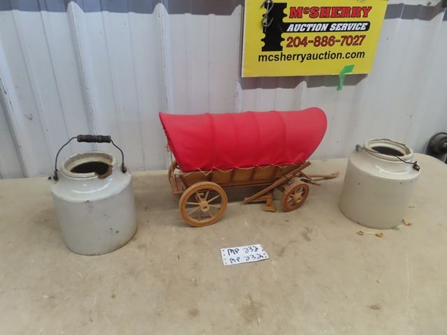 (MP) Chuckwagon Display & 2 Pickle Crocks 1 Has Chip