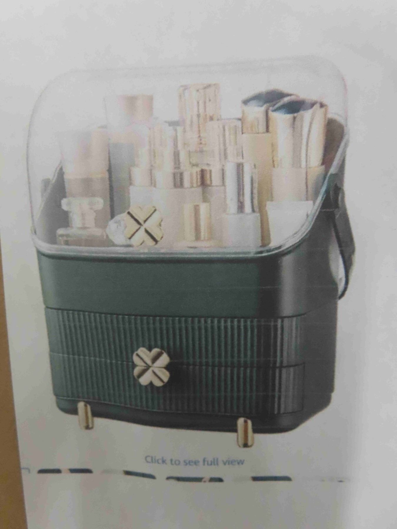 Makeup Holder Organizer 3 Tiers Cosmetic Storage Box with Dust Free Cover Portable Handle 2 Rroomy Drawers,Great for Bathroom Countertop Bedroom Dresser,Dark Green - New or Store Return