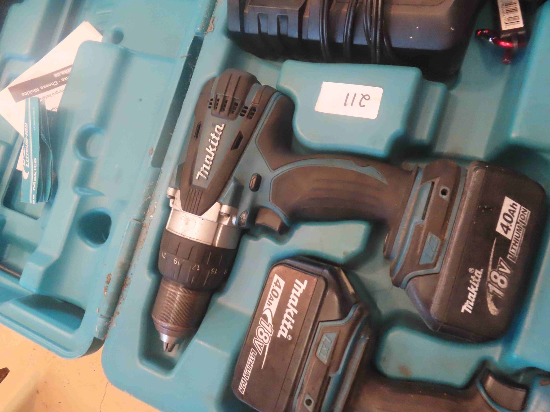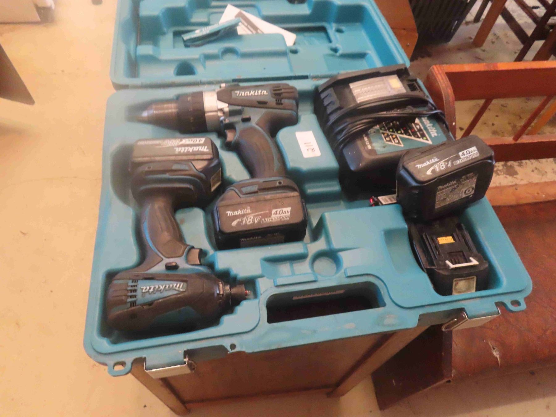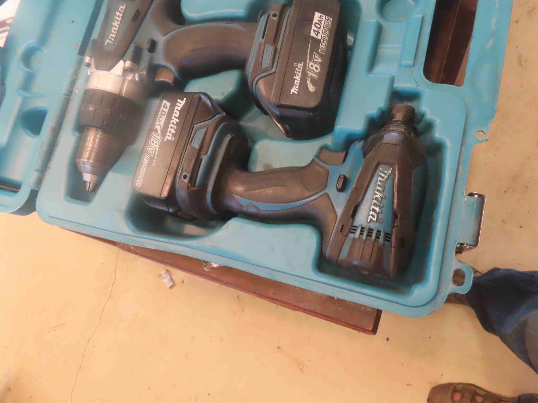 Makita 18V Cordless Tool Set: 1/2 " Drill, 1/4" Impact, 4 Batteries, Charger, case.