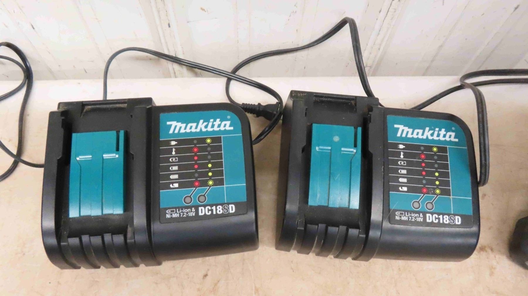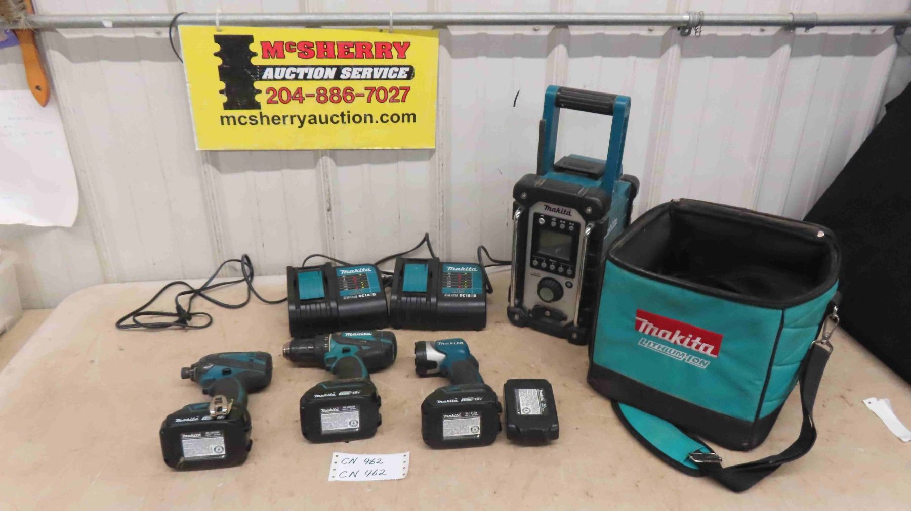 Makita Cordless 18V Items; Drill, Impact, Flashlight, 2 Chargers, 4 Batteries, Radio,