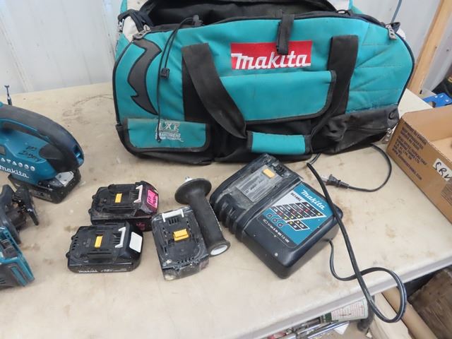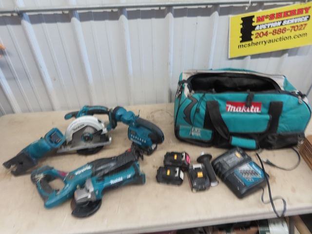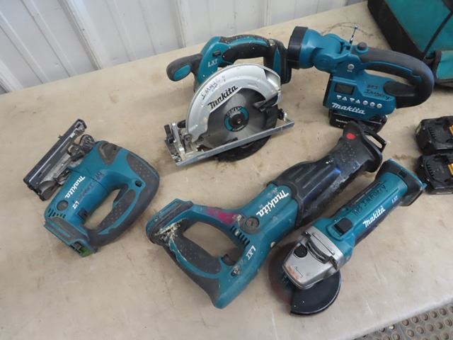 Makita Cordless Tools, Recip Saw, Jig Saw, Circ Saw, Angle Grinder, Flashlight, Charger, 4 Batteries & Bag