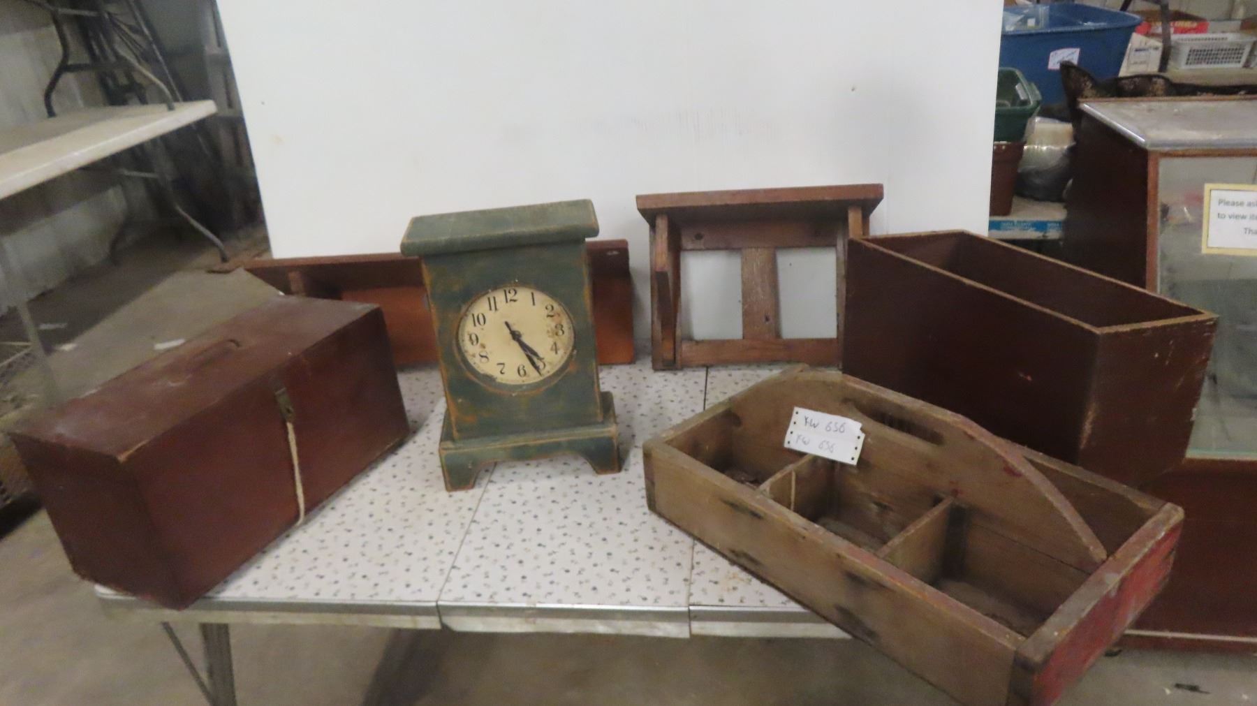 Mantle Clock, Old Shelfs, Carpenters Nail Organizer, Wood Boxes